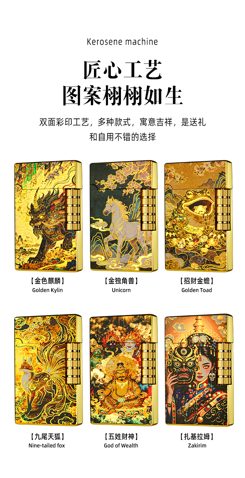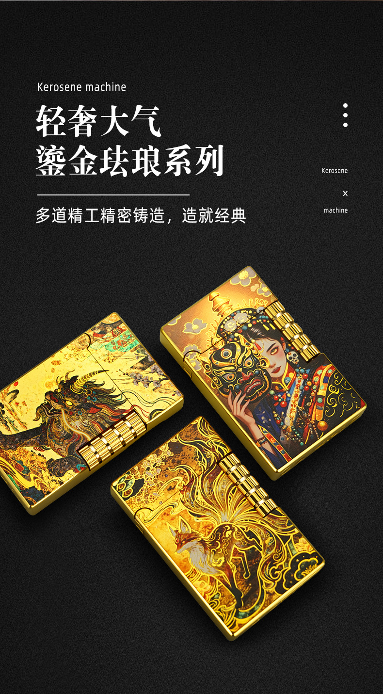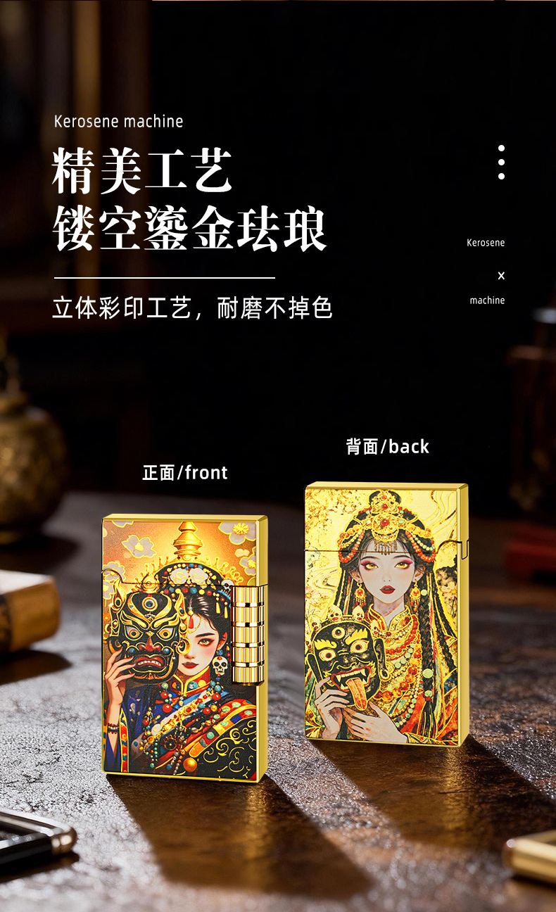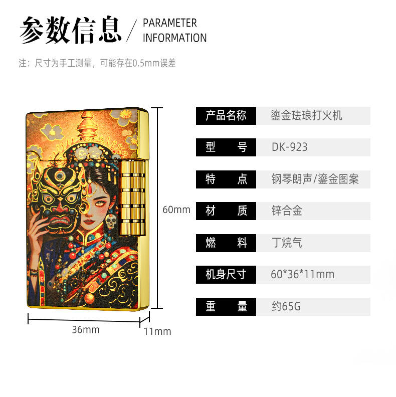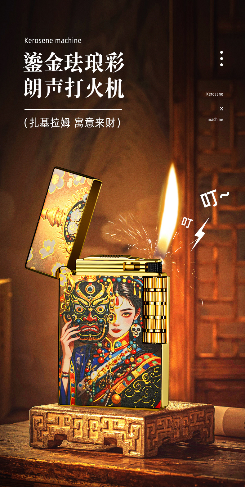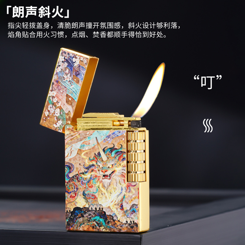 DK-923鎏金珐琅彩印朗声斜火明火砂轮充气金属机身侧滑打火机批发