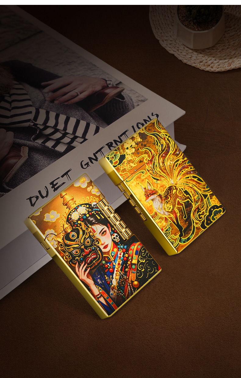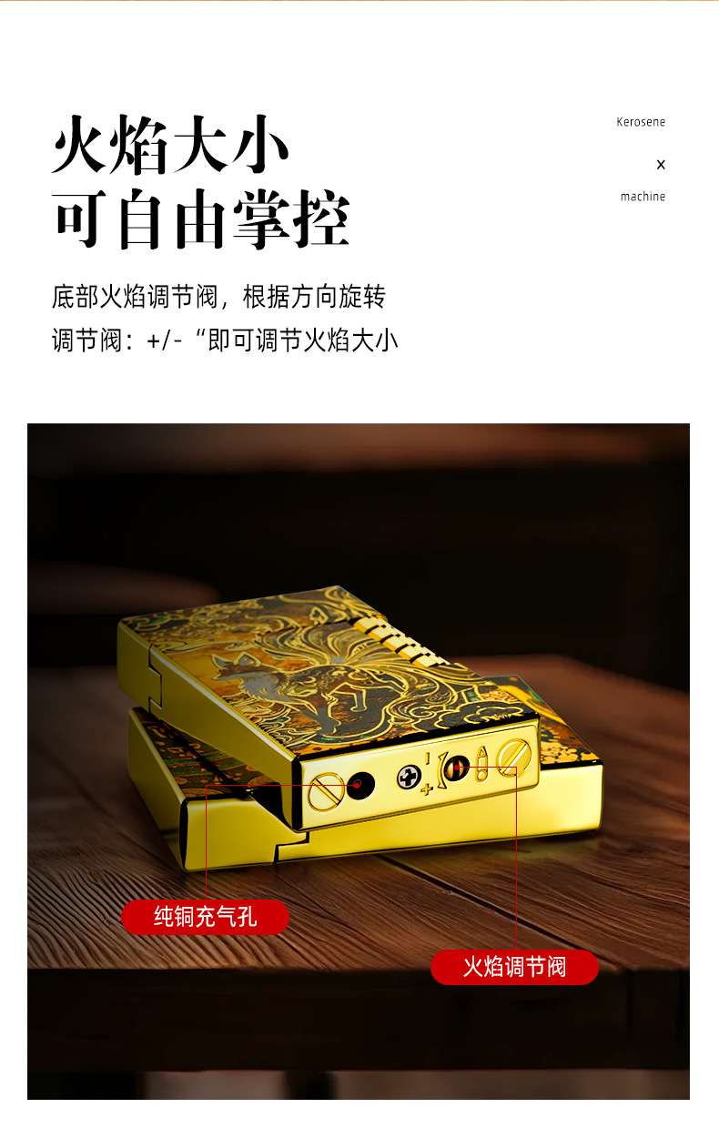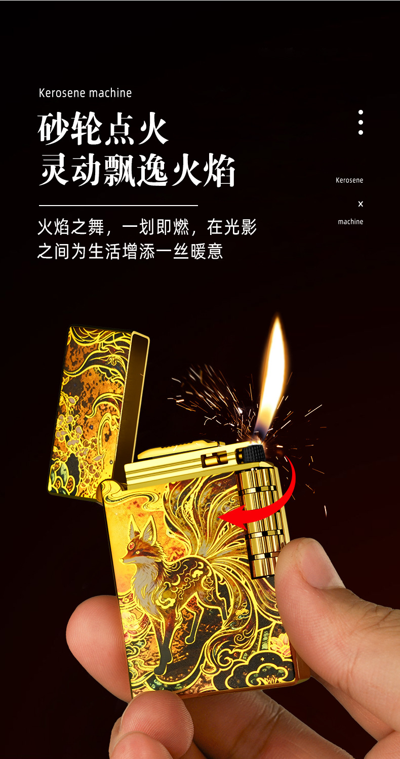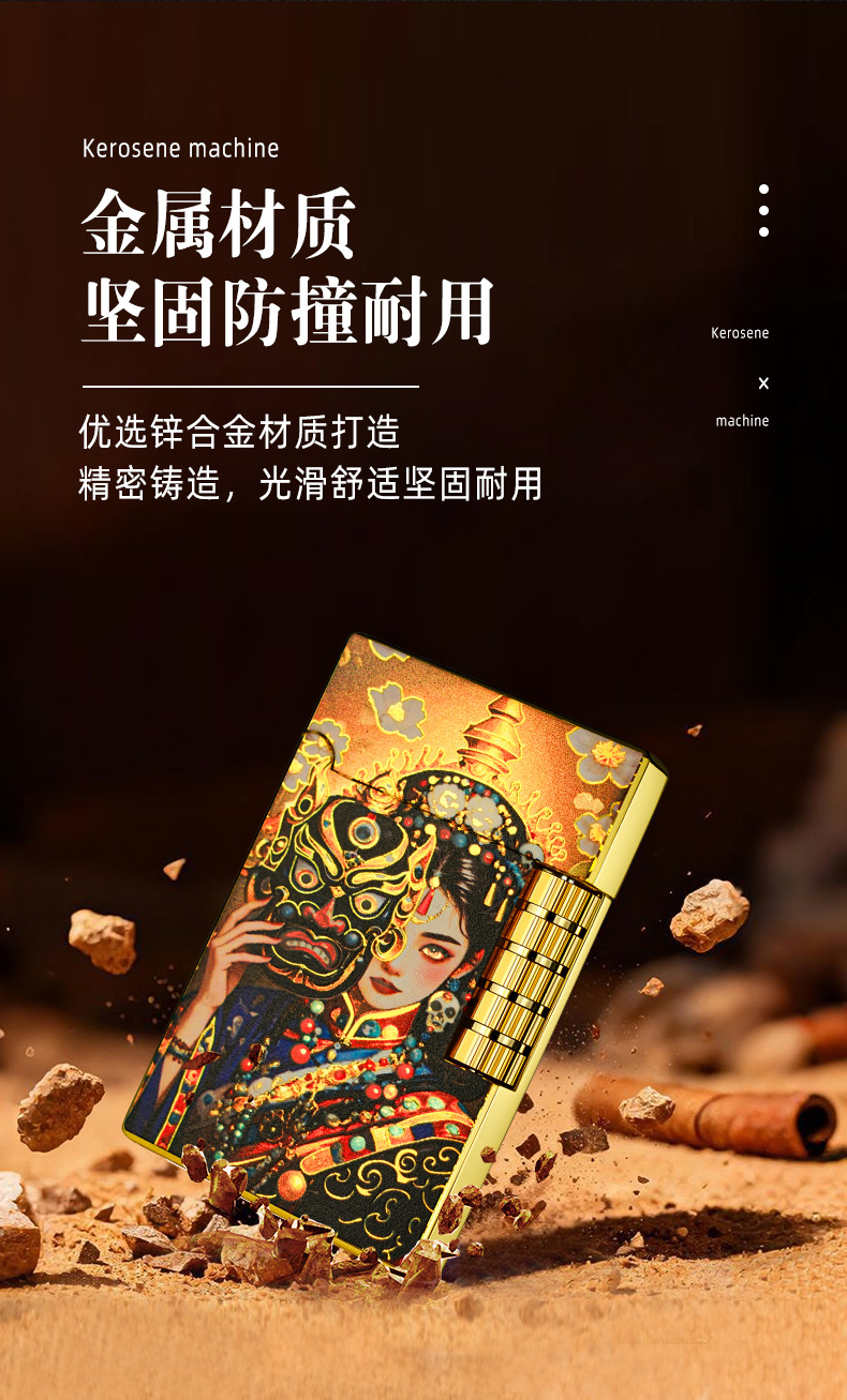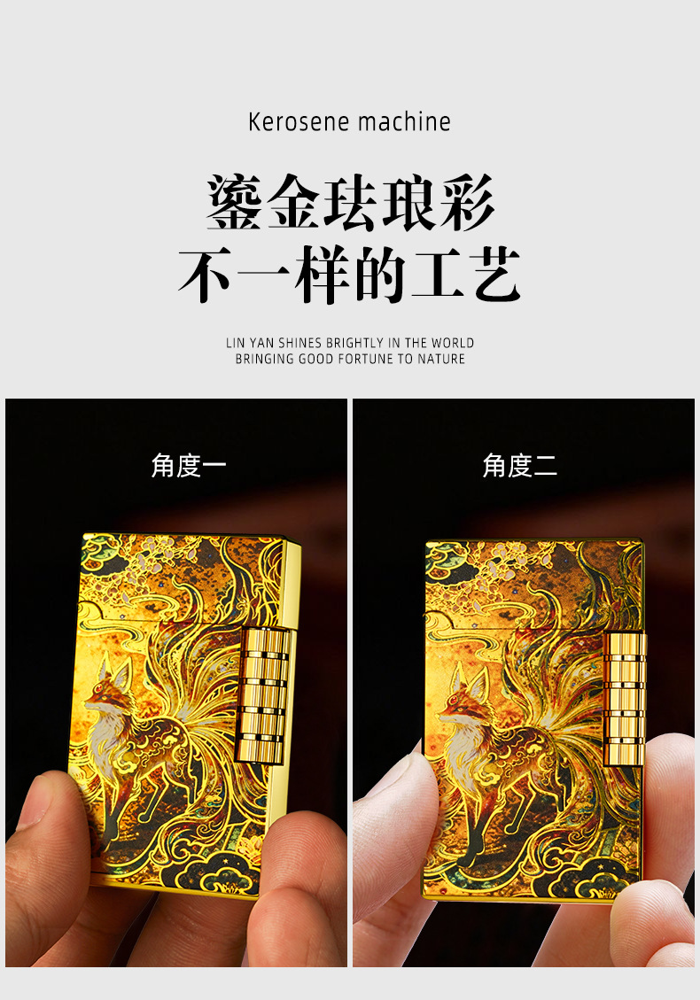 DK-923鎏金珐琅彩印朗声斜火明火砂轮充气金属机身侧滑打火机批发