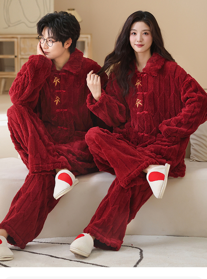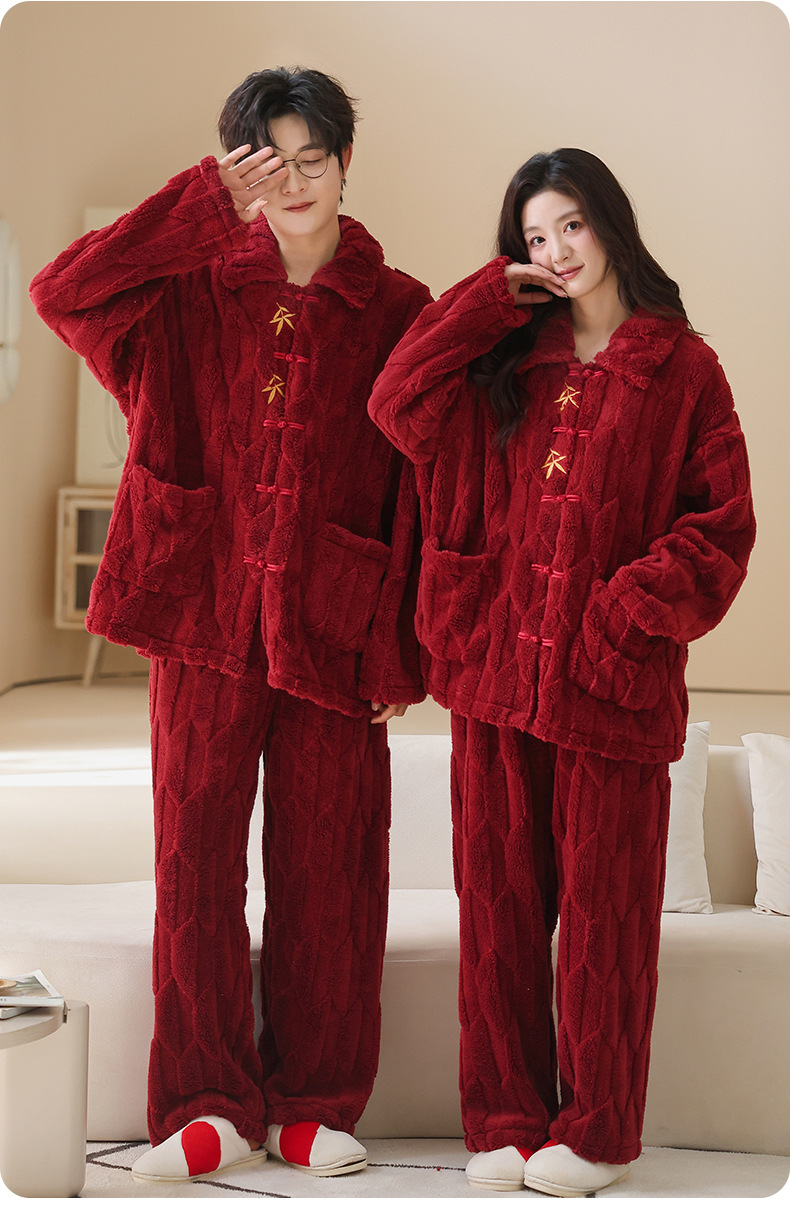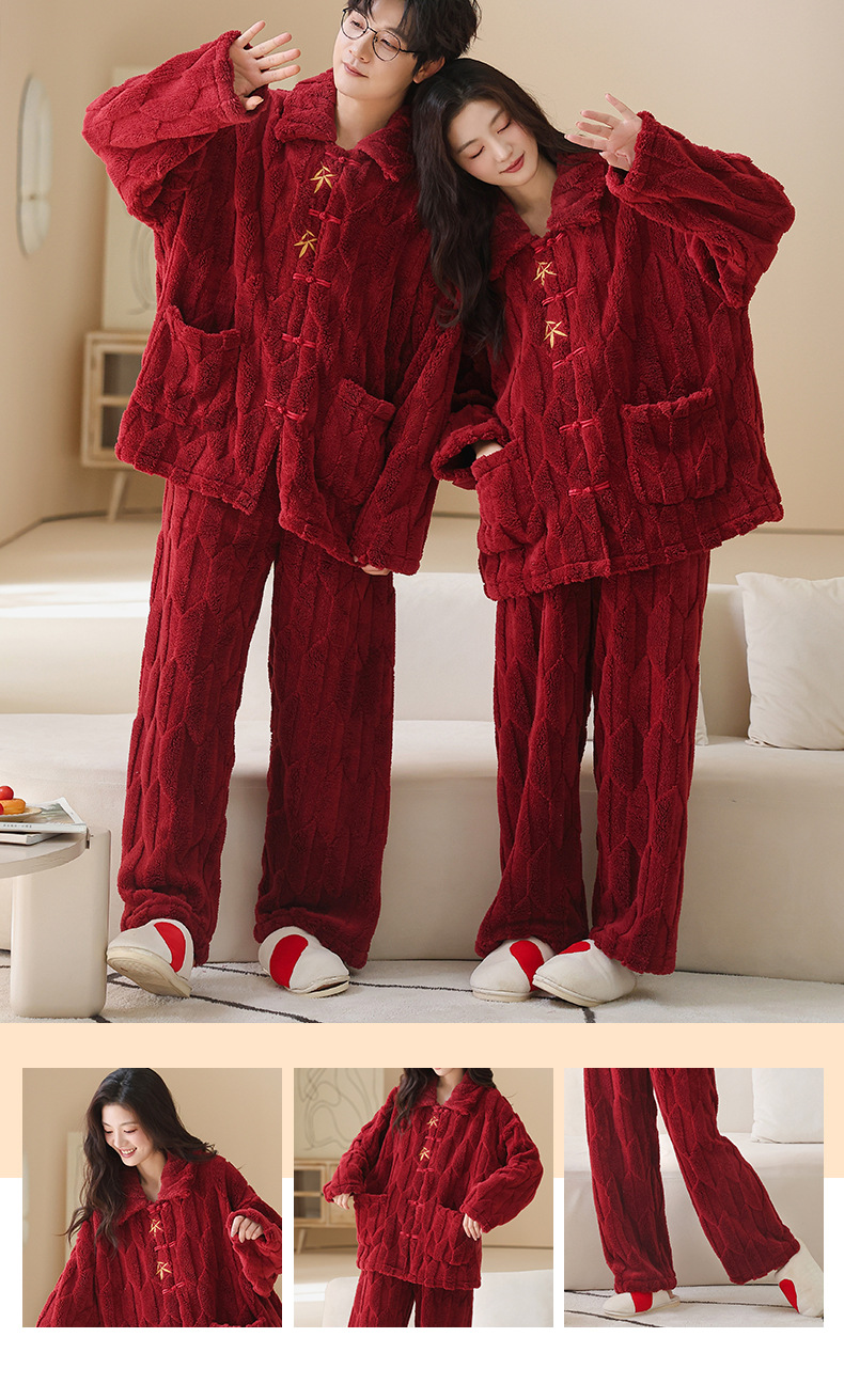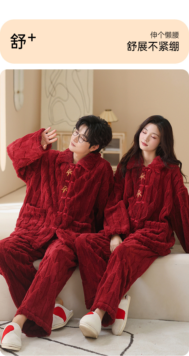 情侣睡衣冬季加绒加厚结婚新婚翻领大红色舒棉绒新中式可外穿套装