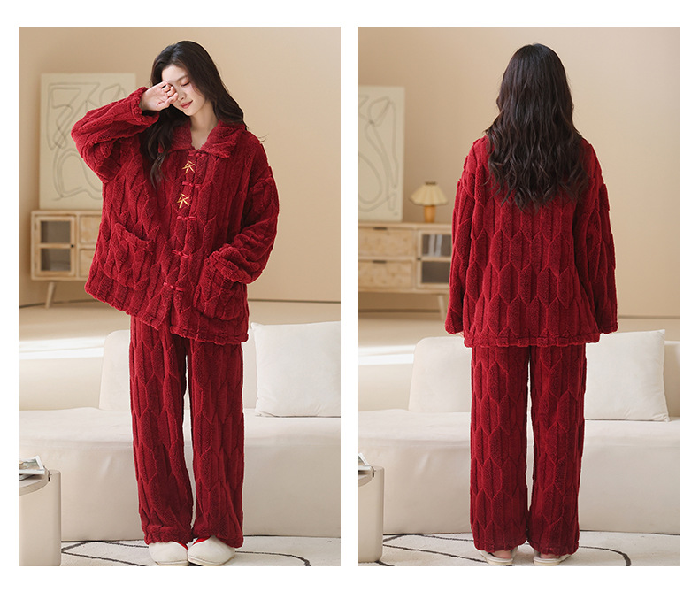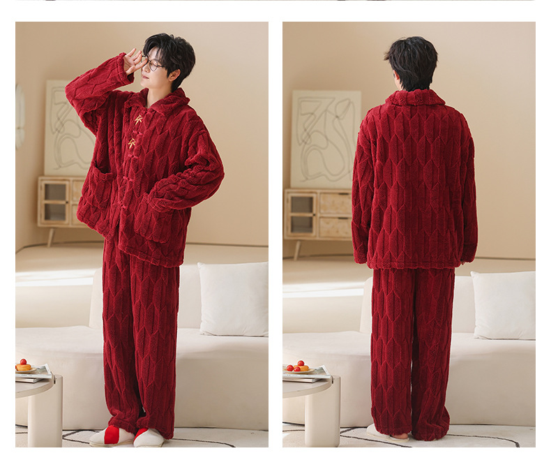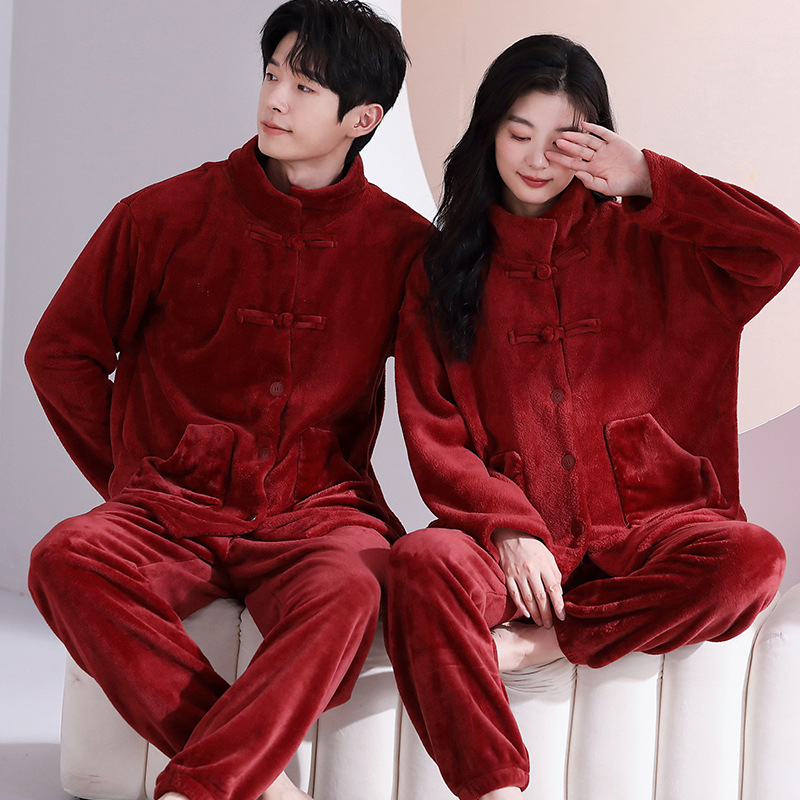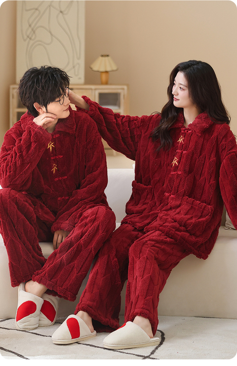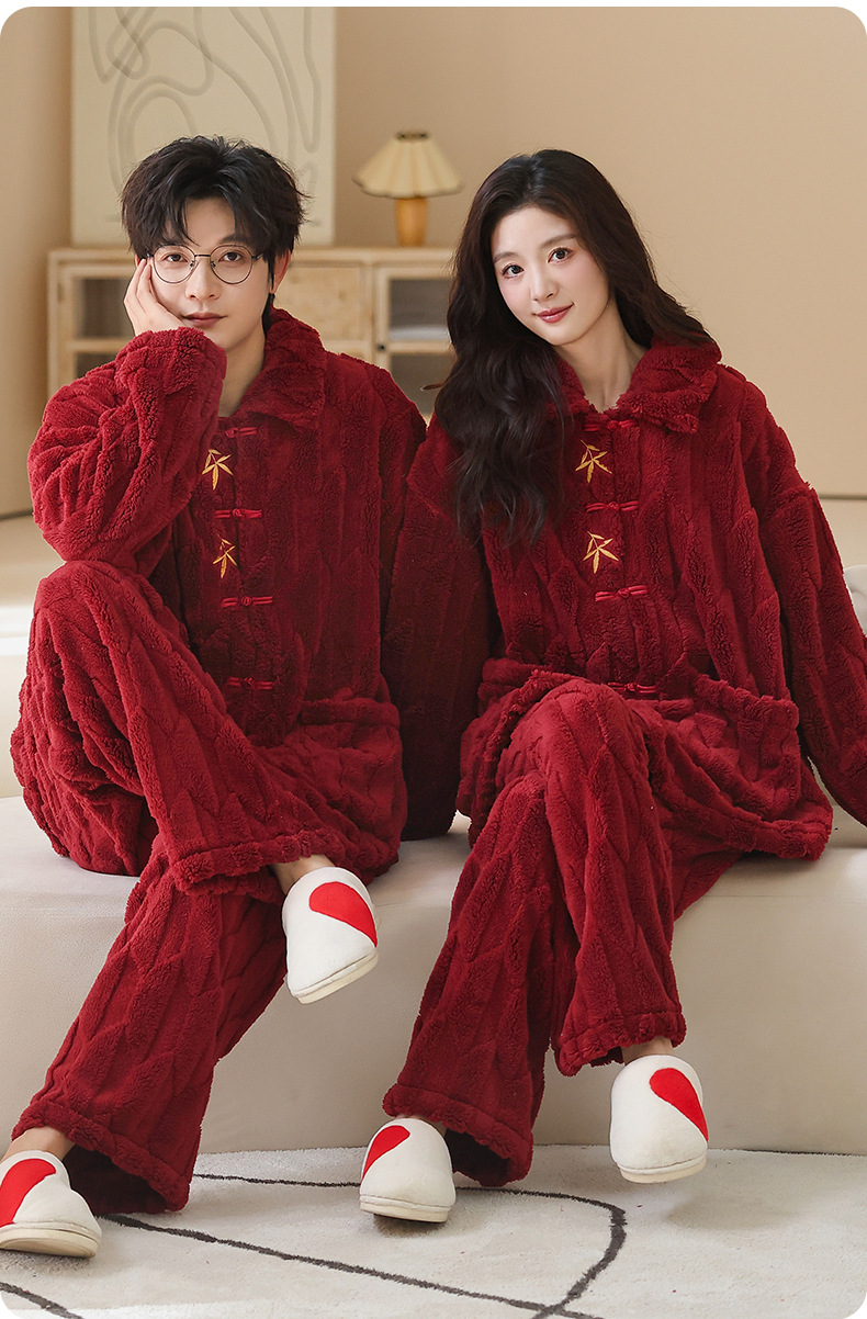 情侣睡衣冬季加绒加厚结婚新婚翻领大红色舒棉绒新中式可外穿套装