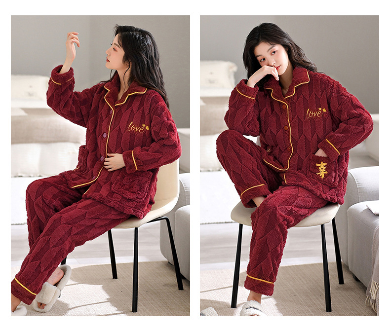 パジャマカップル服冬のサンゴのベルベットの厚いベルベットの赤い結婚新婚フランネルの家庭服セット