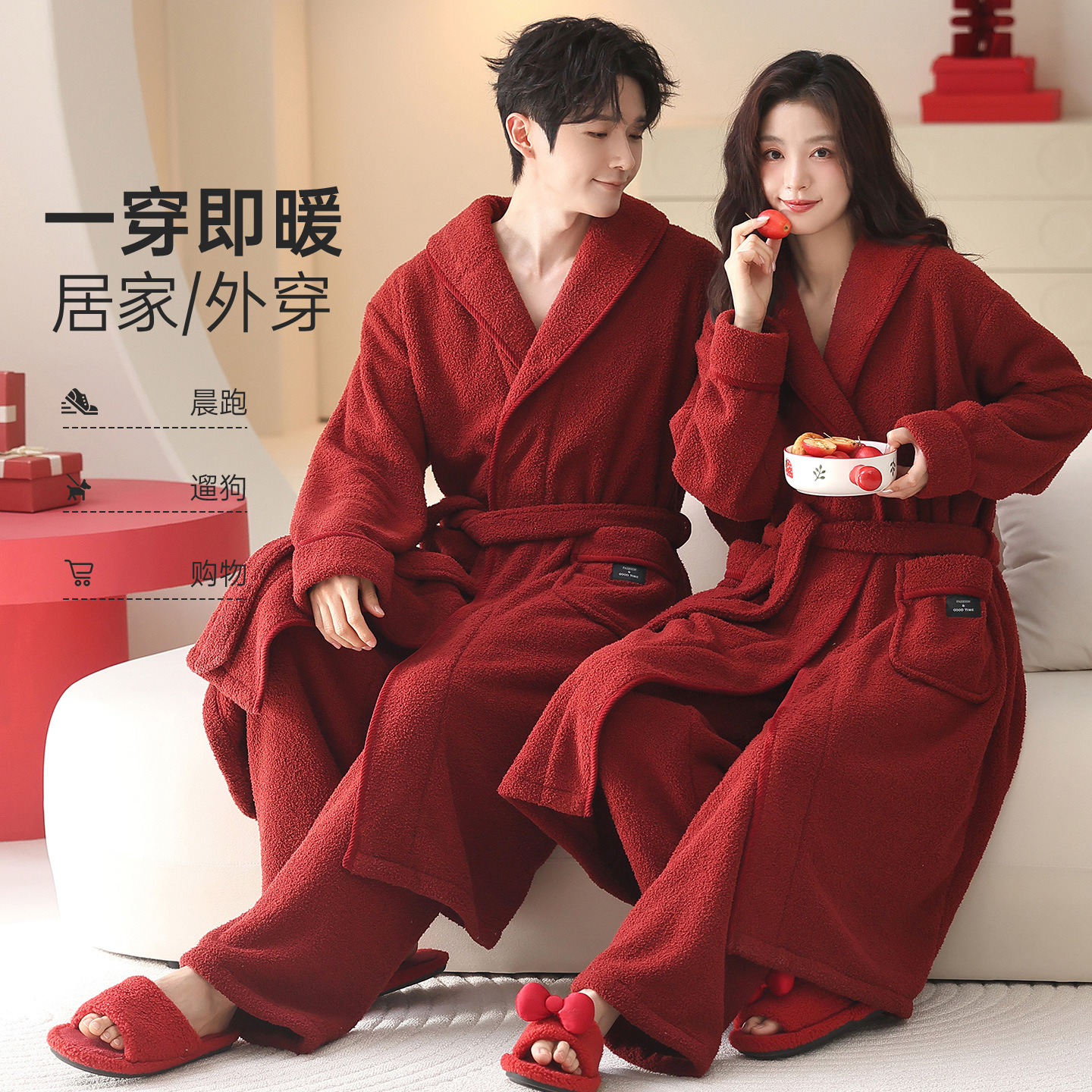 【囍】结婚新婚红情侣套装冬季加绒加厚保暖翻领开衫法兰绒家居服