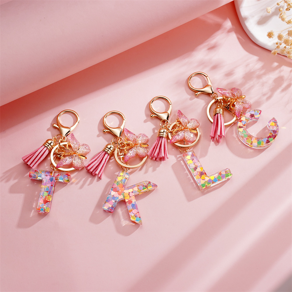 新款时尚粉色树脂亮片蝴蝶字母钥匙扣 手工diy学生包包挂饰小礼品