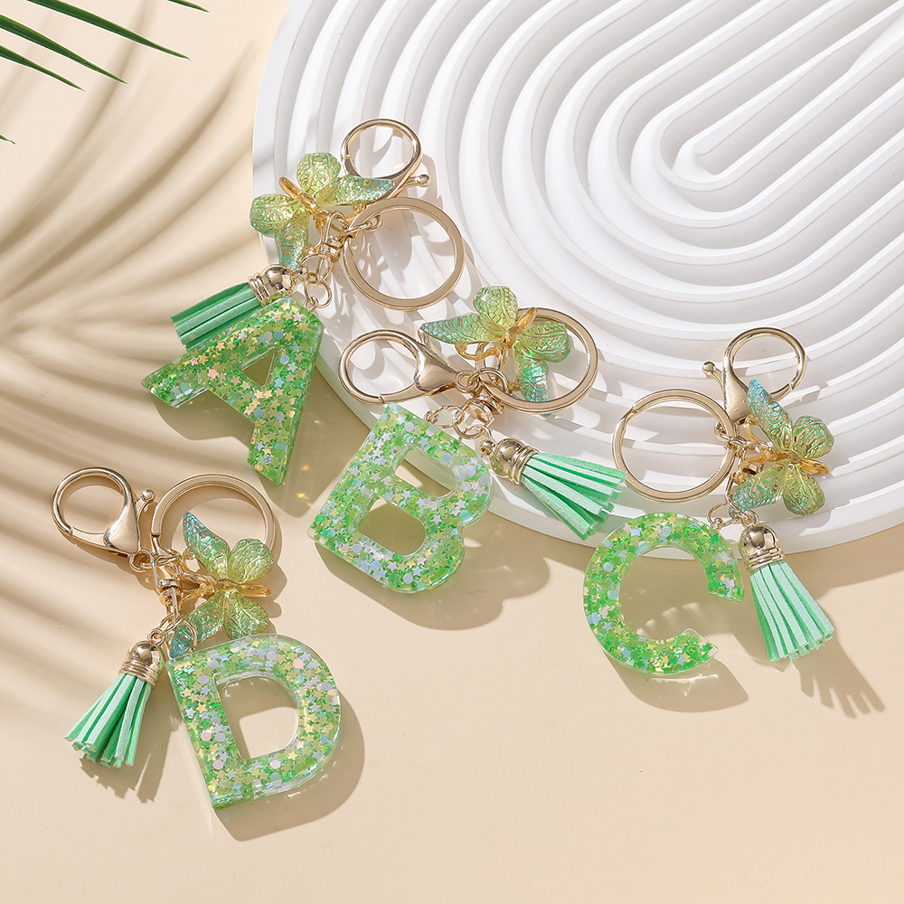 新款滴胶绿色英文字母钥匙扣亮片钥匙链欧美时尚流苏挂饰包包挂件