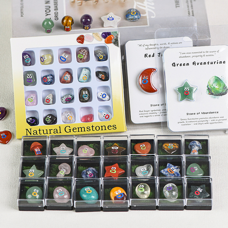 批发天然水晶滚石卡通表情包套盒雕刻件矿标白粉水晶小众礼物摆件