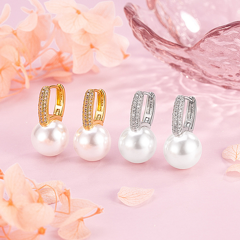 正圆珍珠锆石耳环女法式轻奢高级感耳扣经典气质优雅耳饰百搭
