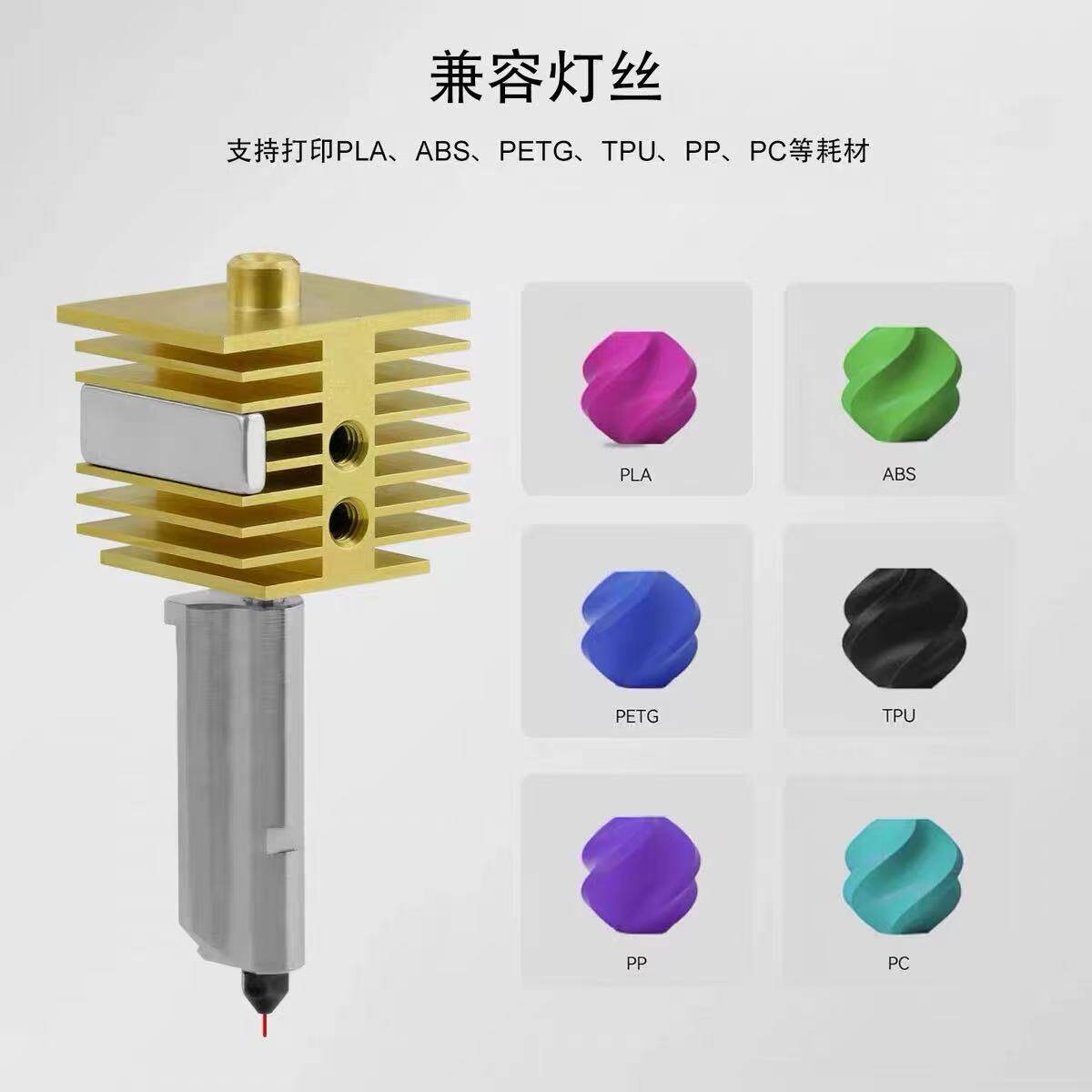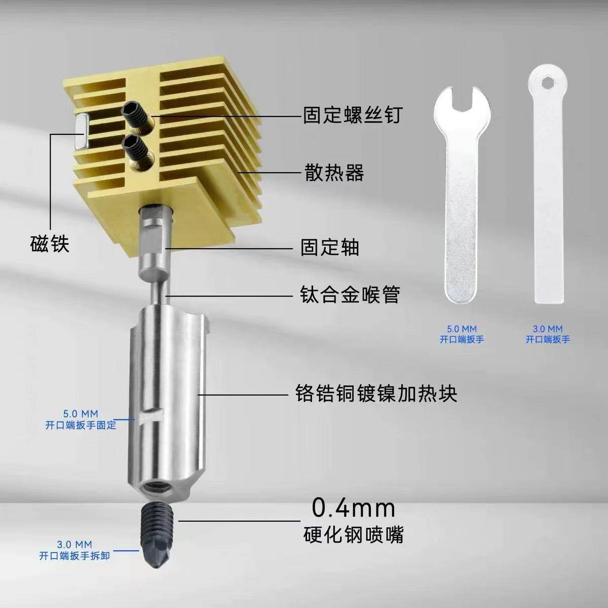 规格 热端0.2mm,热端0.4mm,热端0.6mm,热端0.8mm,硬质钢喷嘴0.2mm,硬质钢喷嘴0.4mm,硬质钢喷嘴0.6mm,硬质钢喷嘴0.8mm,黄铜喷嘴0.2mm,黄铜喷嘴0.4mm,黄铜喷嘴0.6mm,黄铜喷嘴0.8mm,硅胶保护套