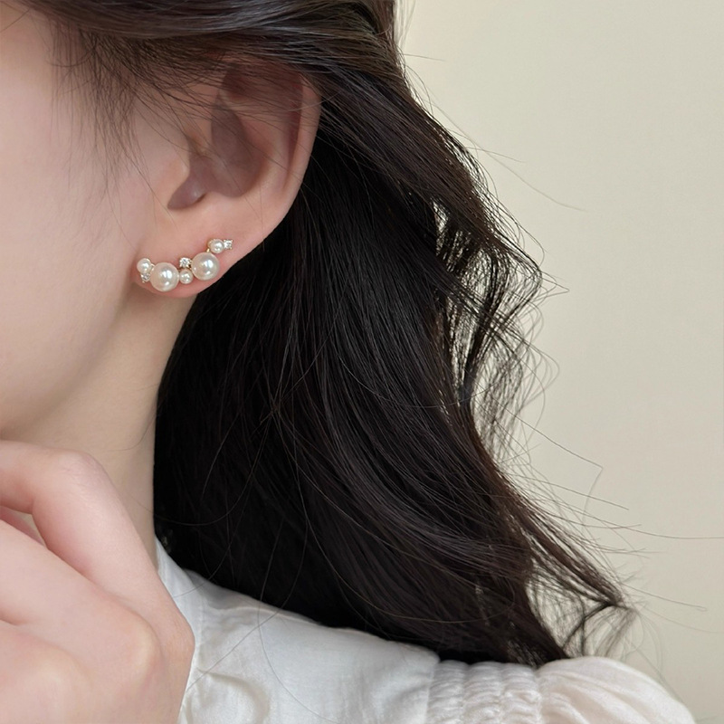 一字错落珍珠锆石耳钉小众轻奢感气质百搭耳环新款简约个性耳饰女