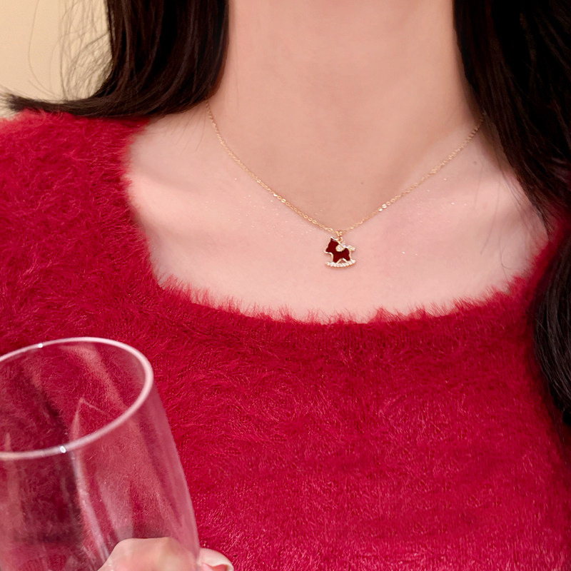 复古酒红色微镶小马吊坠项链女秋冬高级感轻奢小众长款毛衣链饰品