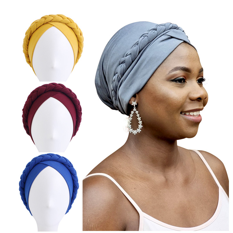 跨境新款麻花辫子头巾帽纯色百搭波西米亚风包头巾化疗帽JDT-429H