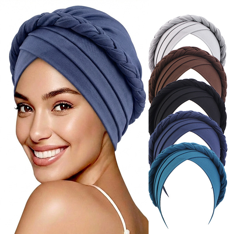 跨境新款麻花辫子头巾帽纯色百搭波西米亚风包头巾化疗帽 JDT-429H