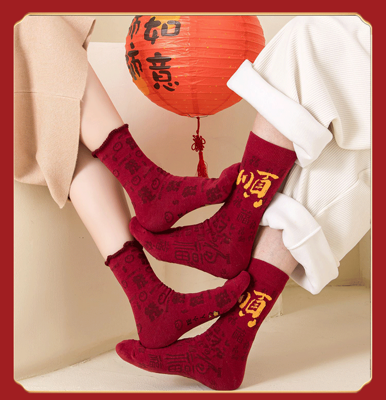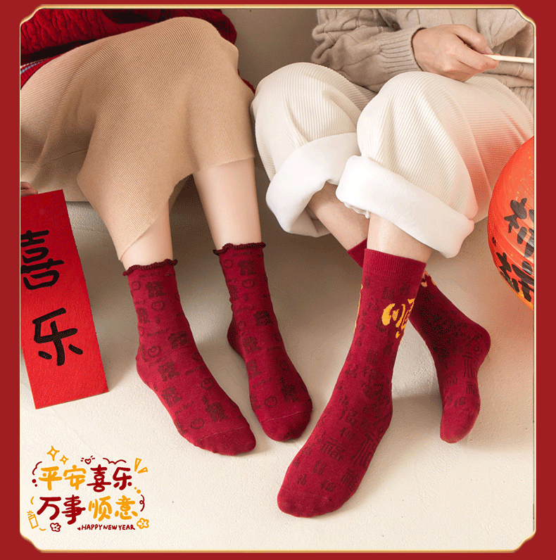 2026年新年干支年赤い靴下男女兼用ミドル丈万能赤色新年靴下お祝い開運カップル用綿靴下