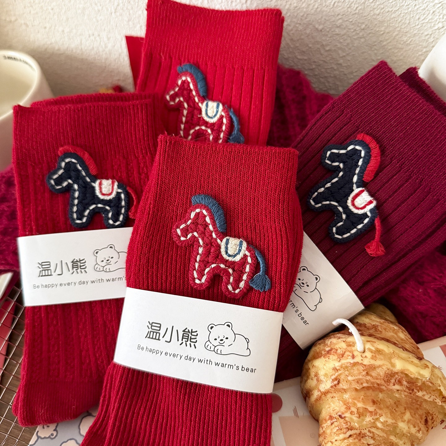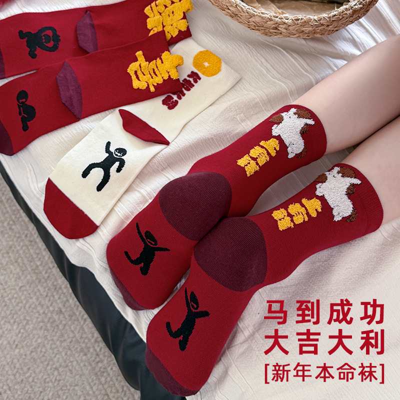 2026年马年本命年新年大红酒红色袜子女卡通红袜子中筒棉过年礼物