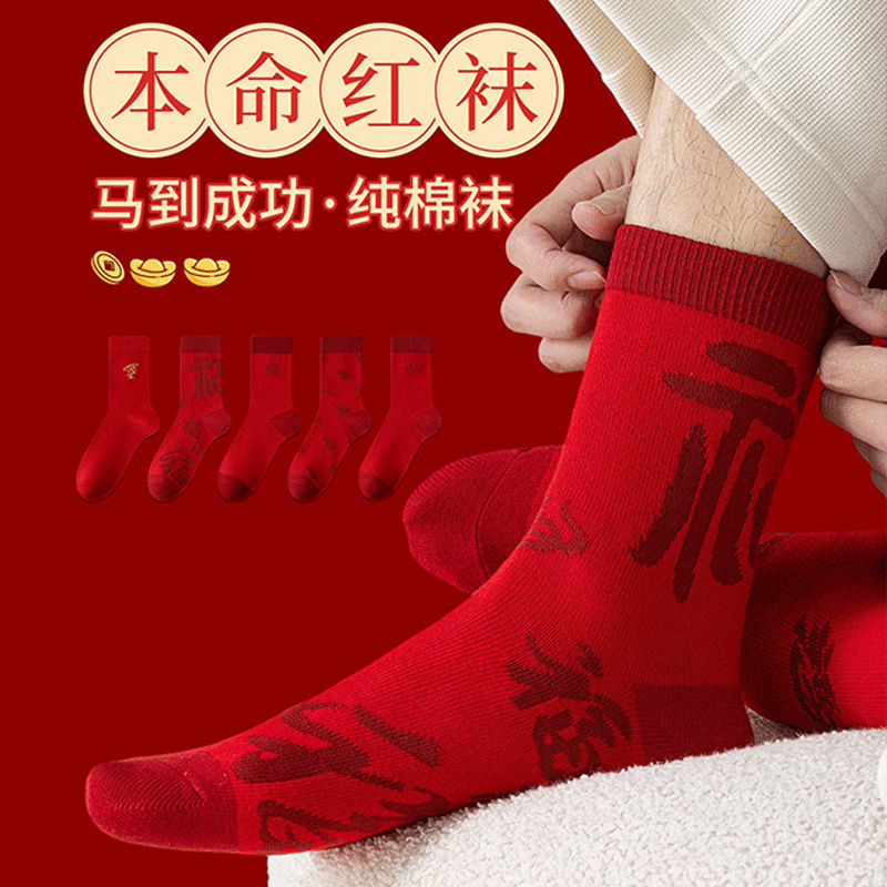 2026新年本命年红袜子男女中筒百搭红色过年袜喜庆发财情侣款棉袜