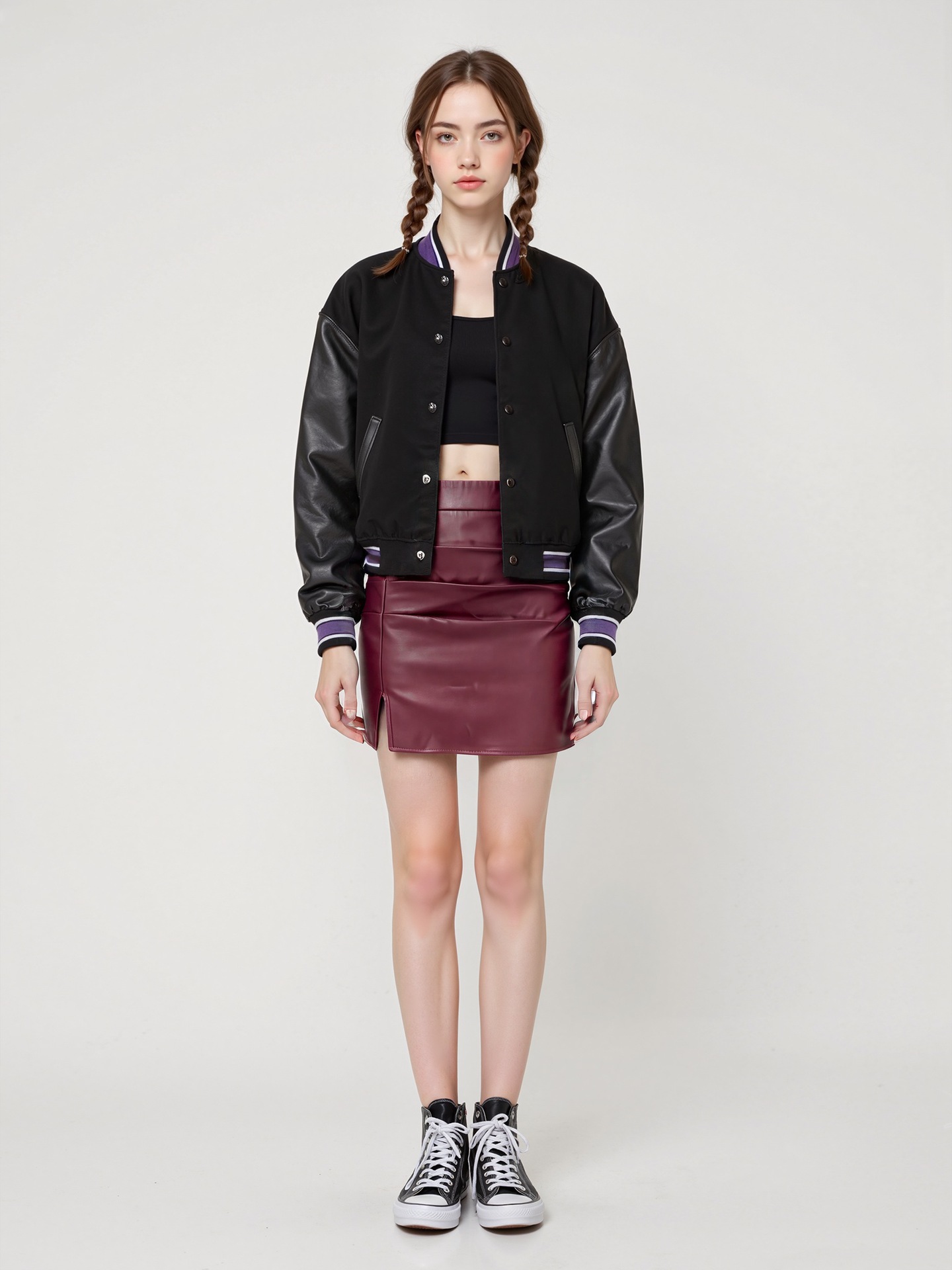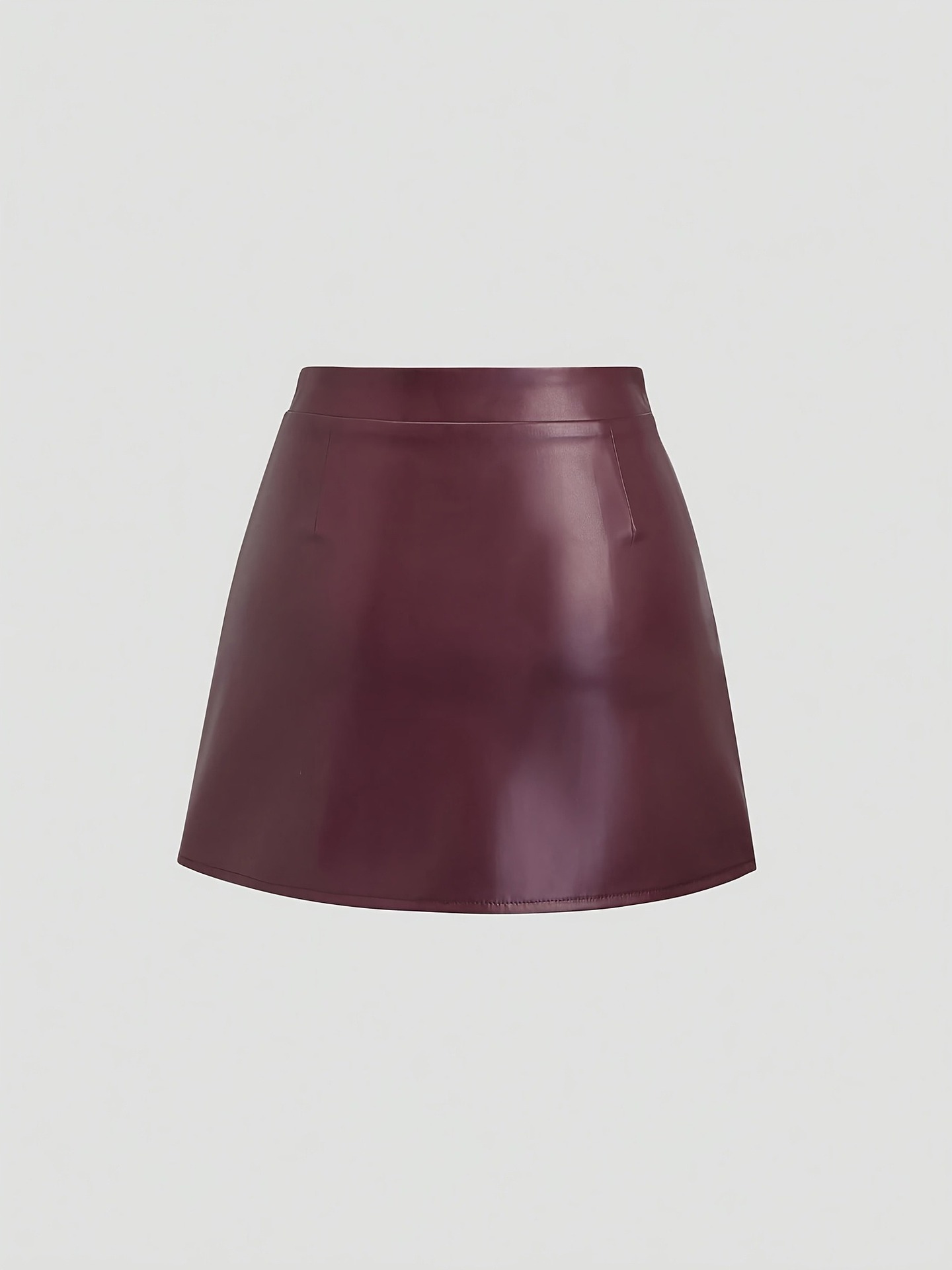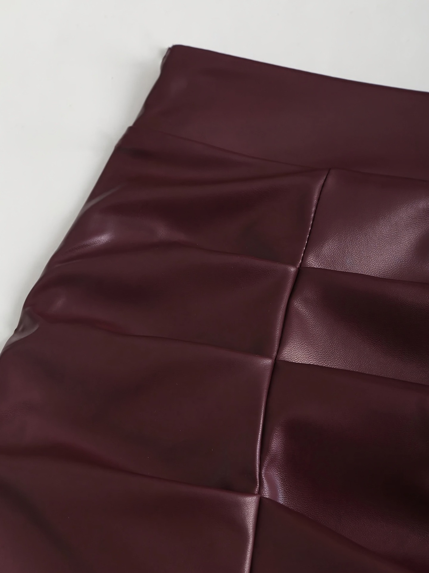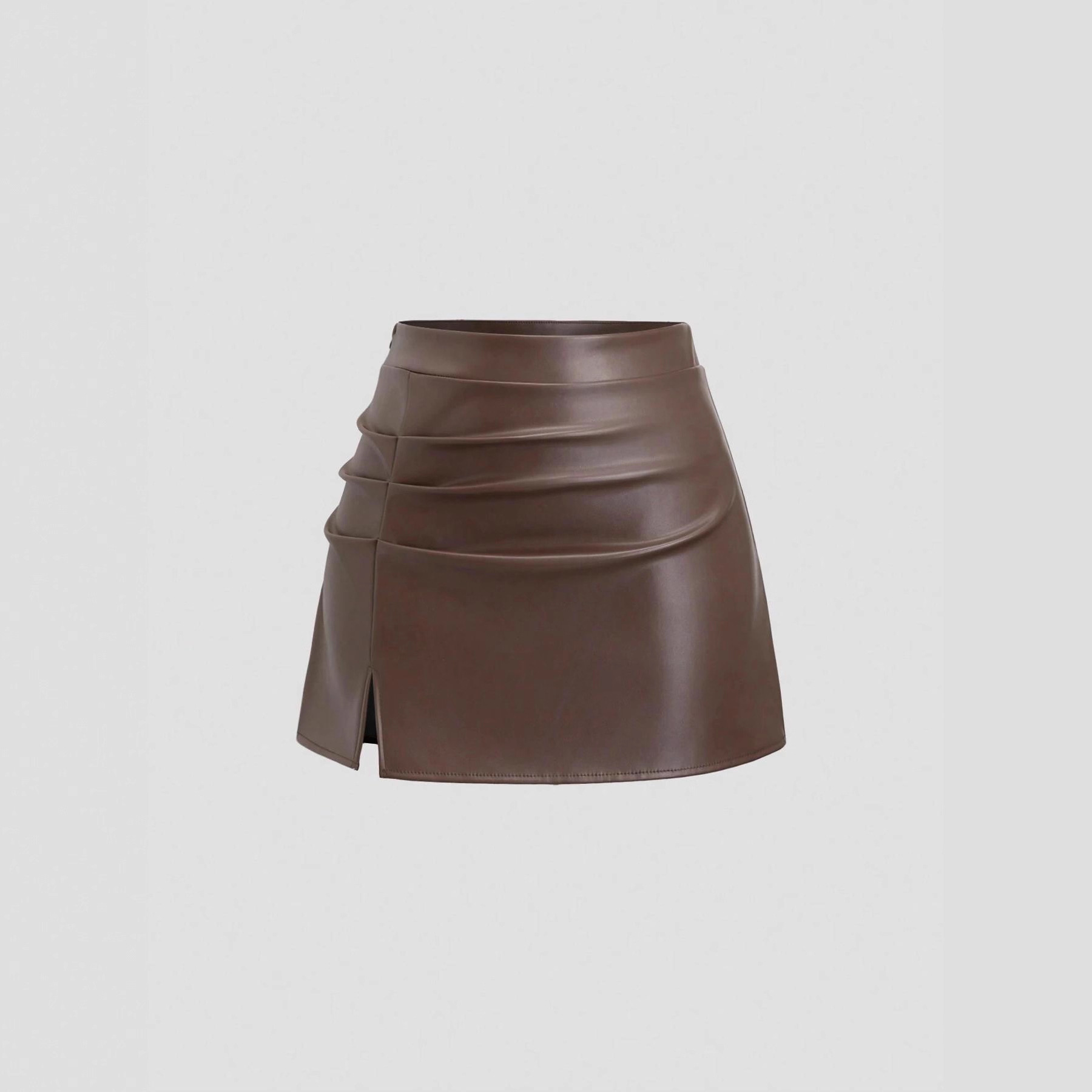 2026春夏新款女式素色皮革PU麂皮材质迷你裙,带侧缝和褶边细节