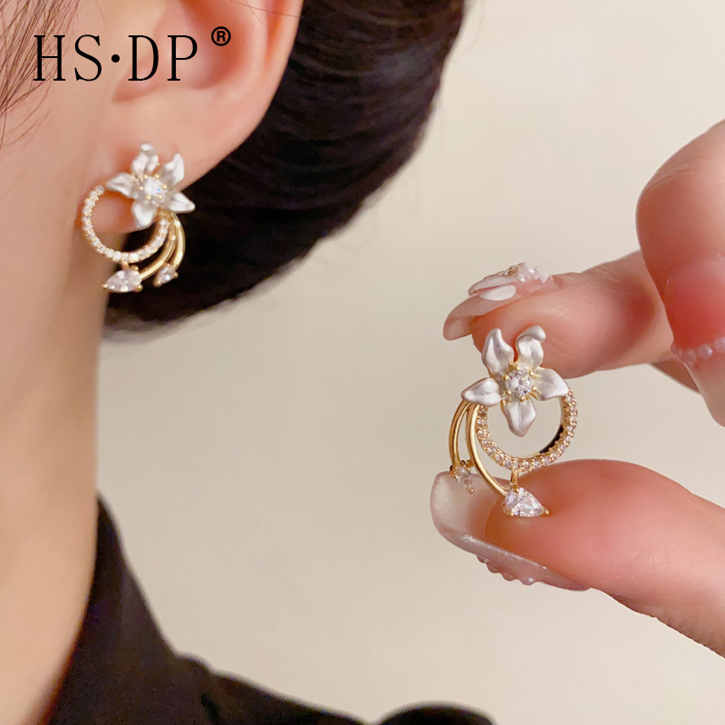 法式甜美百搭白色花瓣锆石圆环耳钉女气质轻奢简约设计感耳环批发