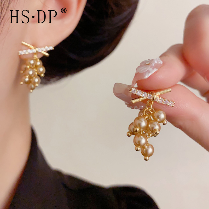 小众时尚温柔百搭锆石交叉珍珠流苏耳坠气质简约轻奢显瘦耳环批发