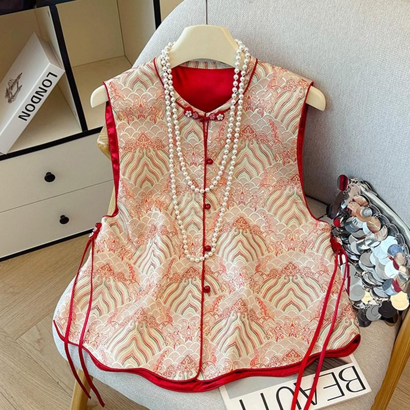 2025年の春の新型の新中国式のバックルの肩の上着の国風の馬の甲の婦人服の馬のベストの百合の袖なし