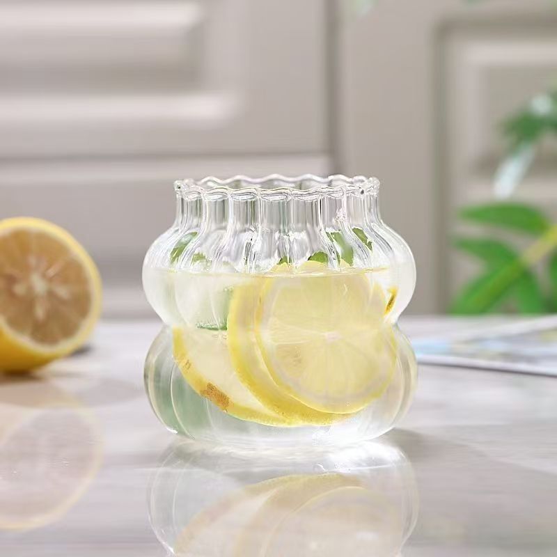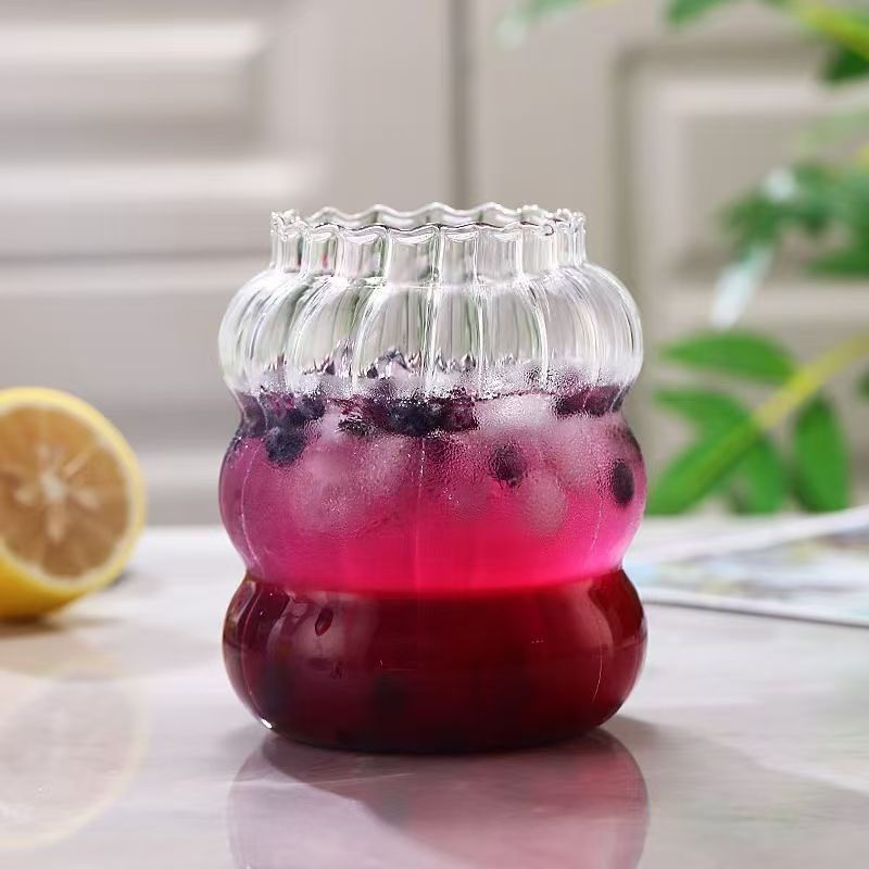 竖纹单层透明胖鼓鼓泡茶杯大容量高硼硅玻璃毛毛虫牛奶饮料果汁杯