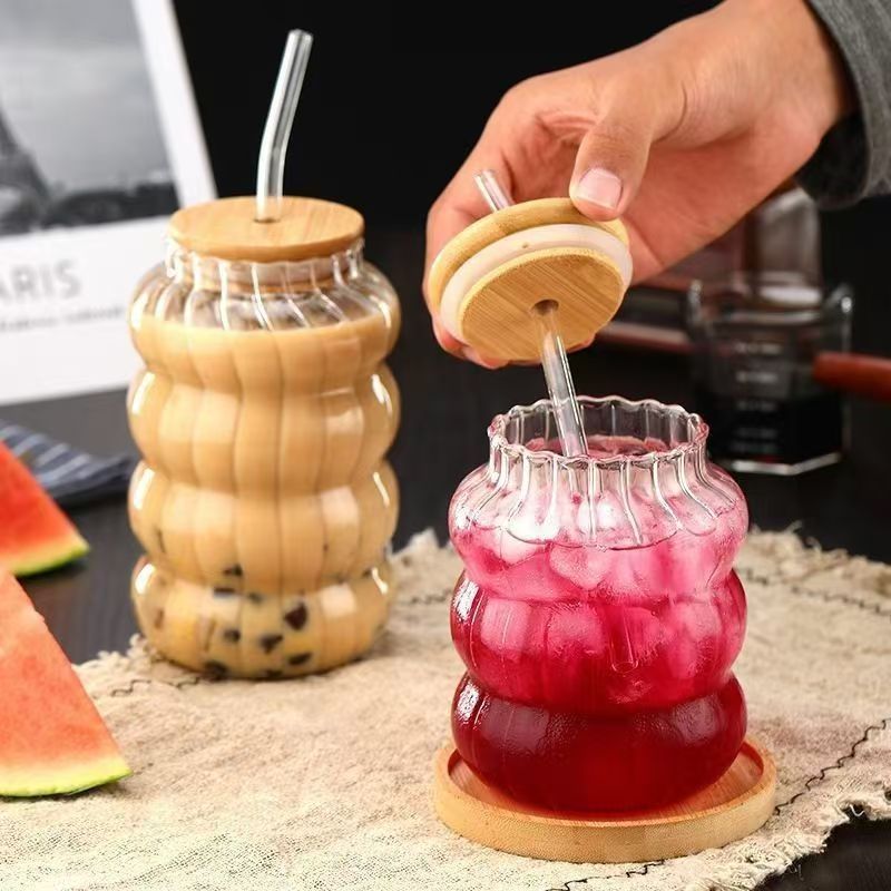 高ホウケイ酸ガラスキャタピラーカップシンプルサークルカップミルクティーカップストロー付きスパイラル波形ガラスウォーターカップ