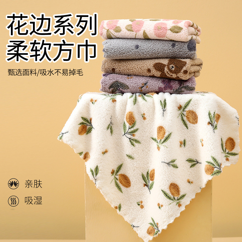 新作の越境配送対応、プリント柄の花柄コーラルベルベットの花飾り付きスクエアタオル、吸水性のあるベア柄スクエアタオル、雑巾、クリーニングタオル