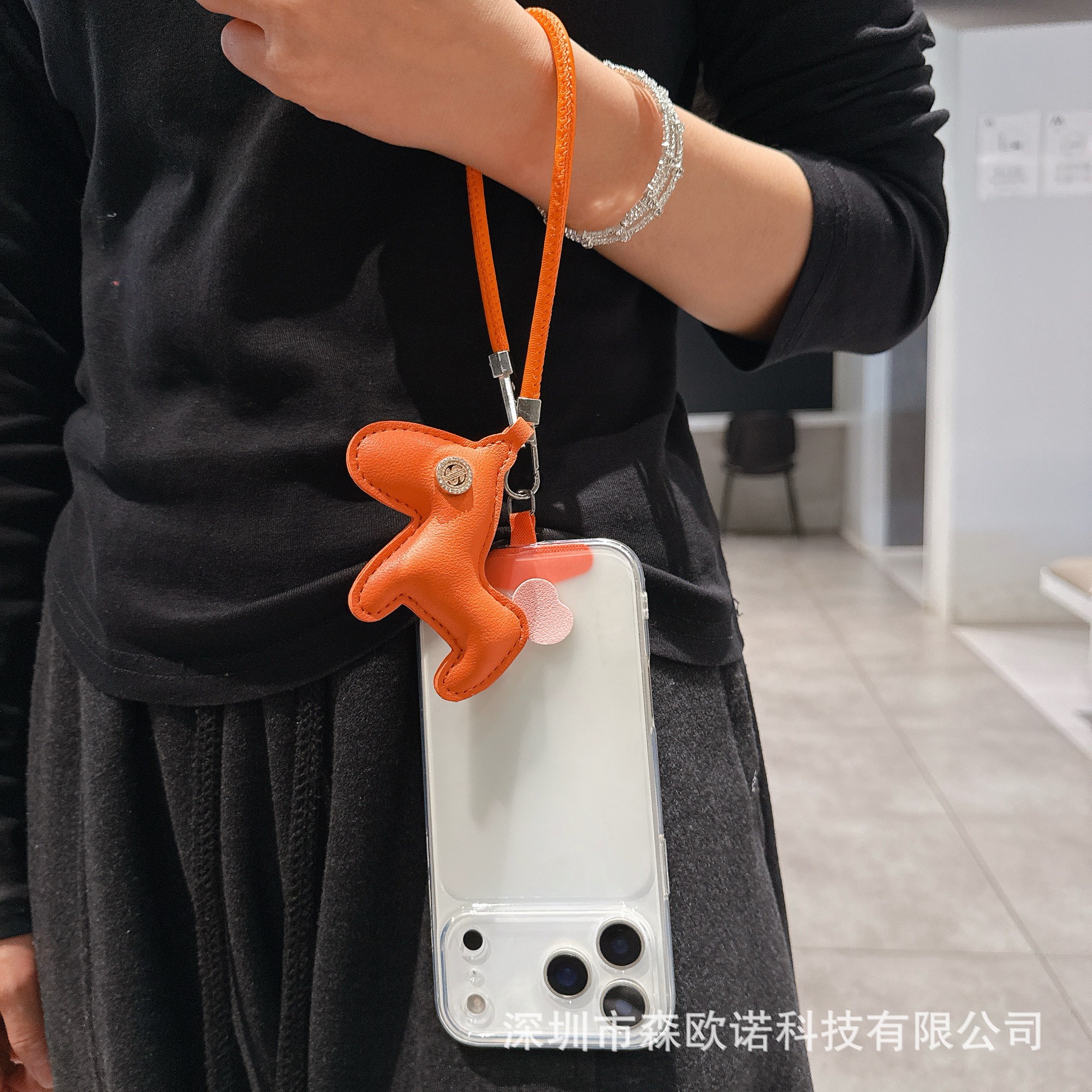 创意黑色皮质冲棉小马吊坠手机挂绳包包挂饰腕带式手提短款挂绳