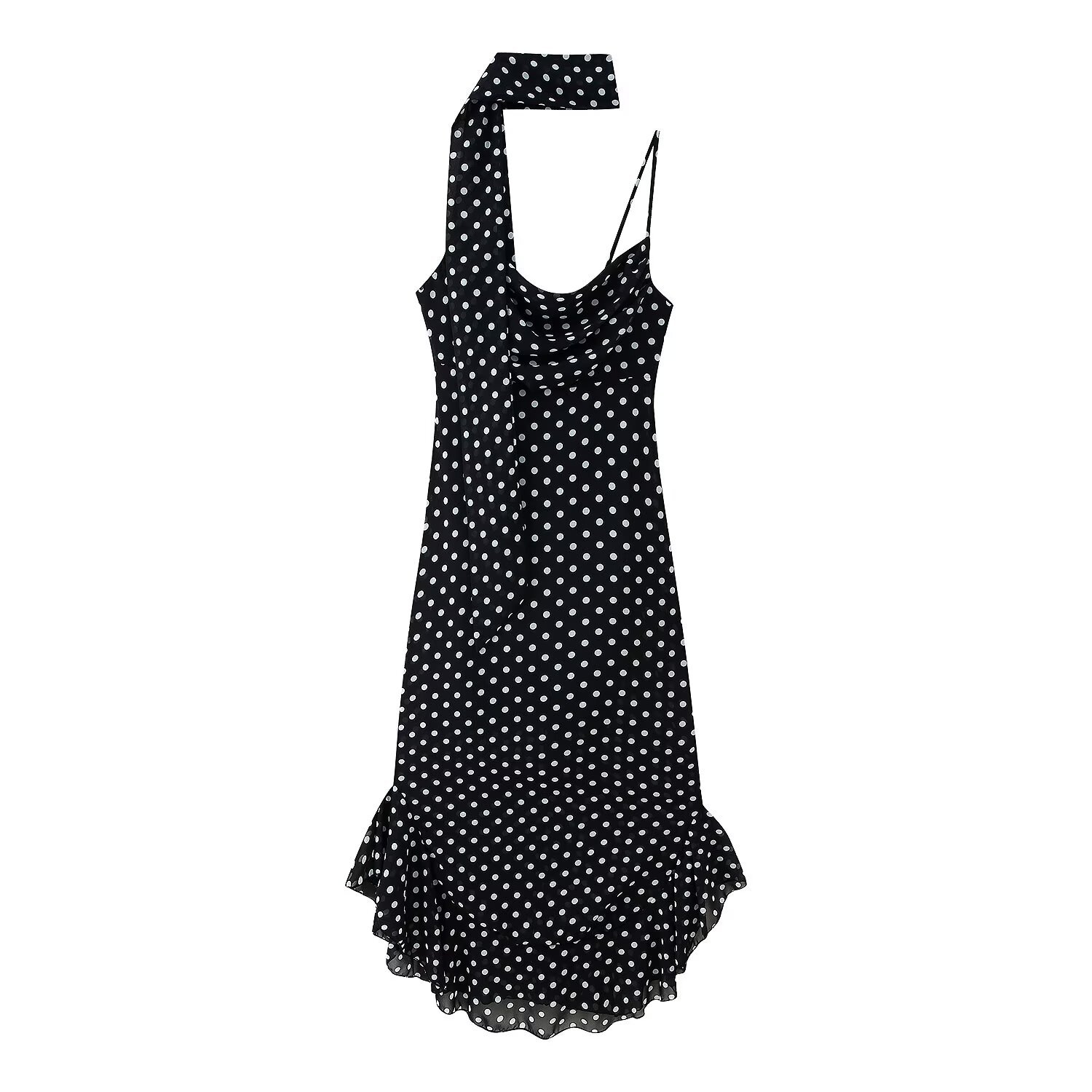 BSK&TRAF女装2025年夏季新款度假风修身荷叶边吊带波点围巾连衣裙
