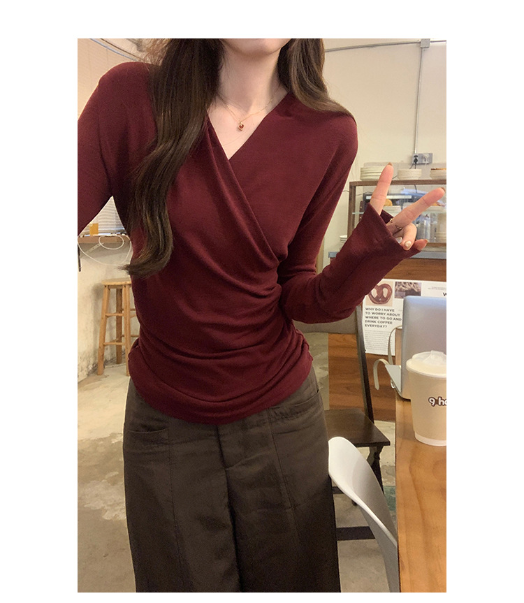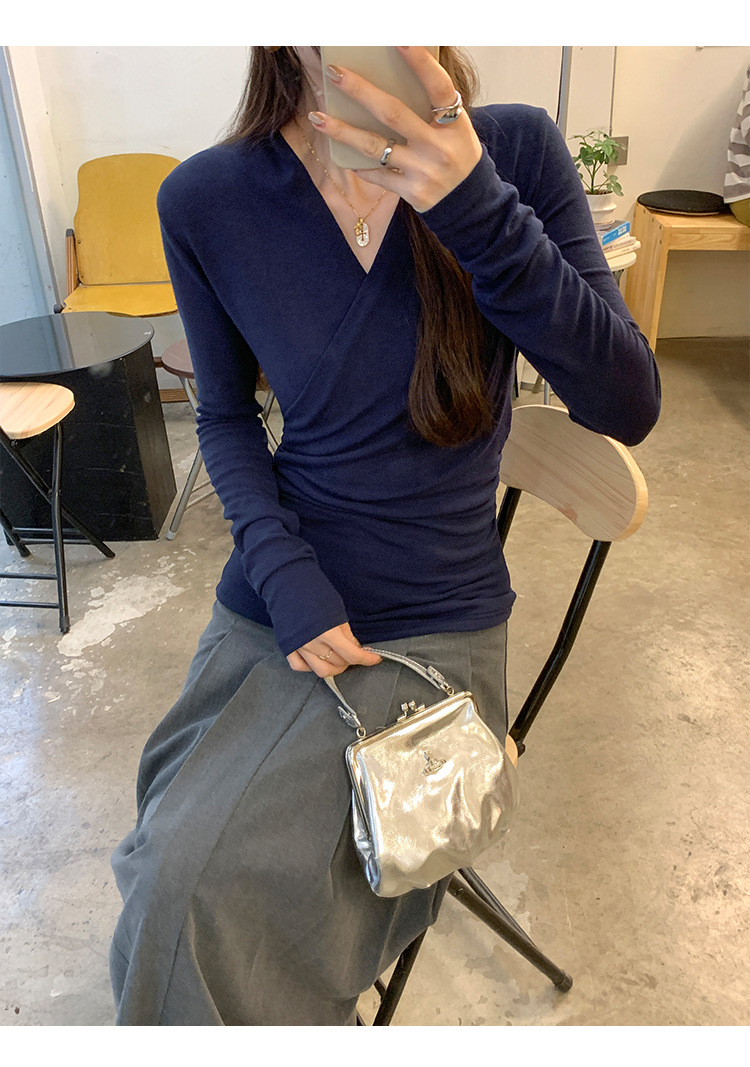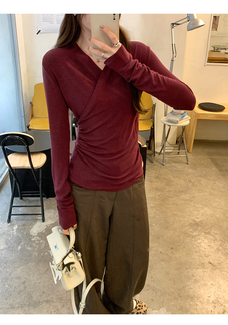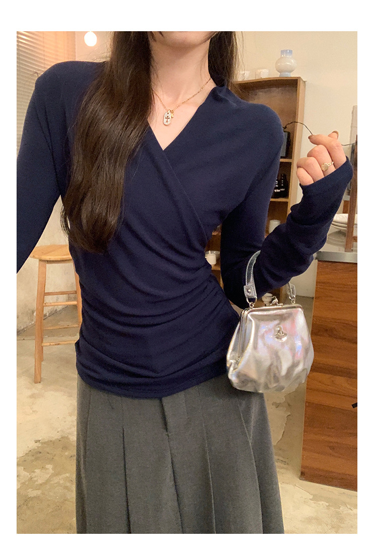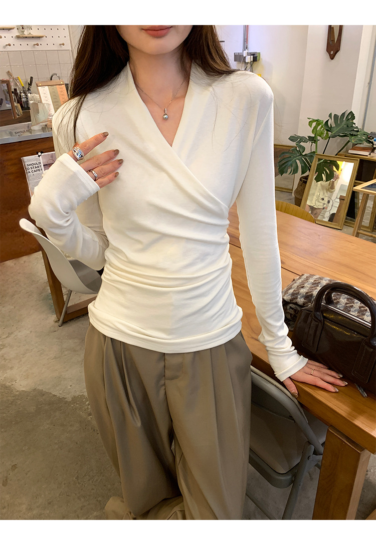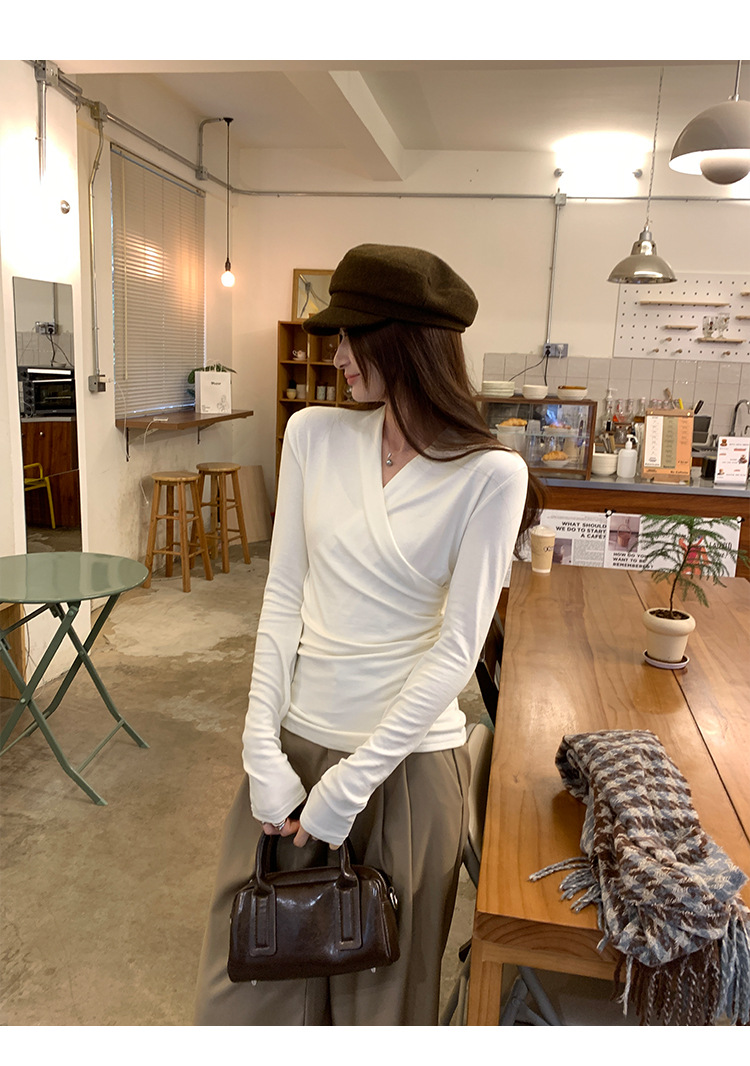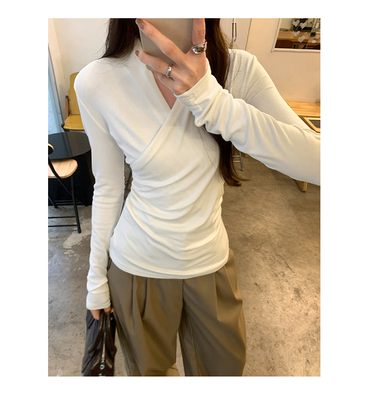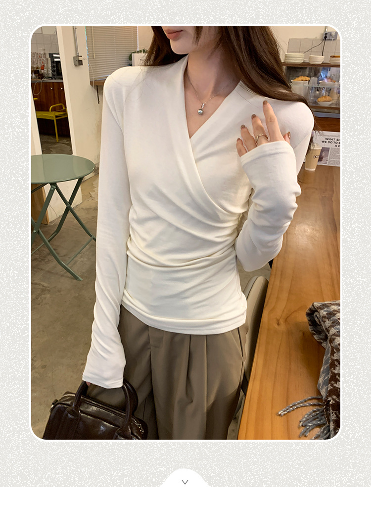 秋冬の実写図ギャルvネックの白いインナーシャツの女性の洋風デザイン感がとても美しいtシャツです。