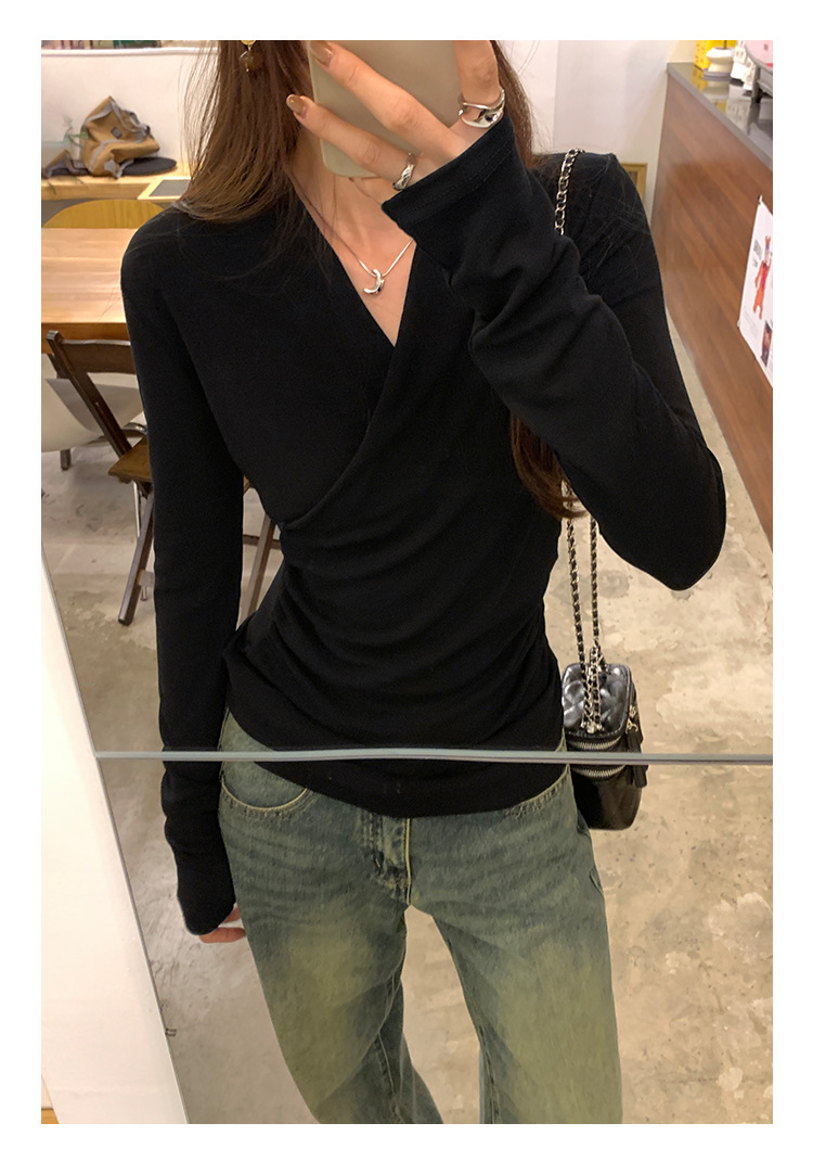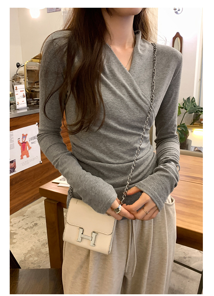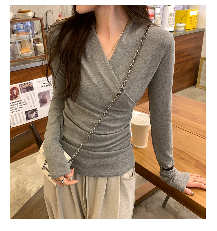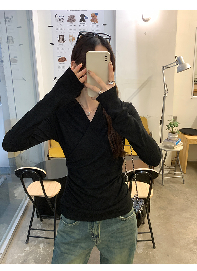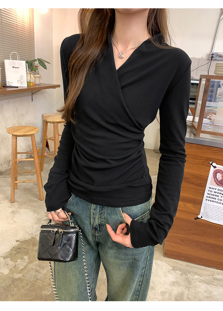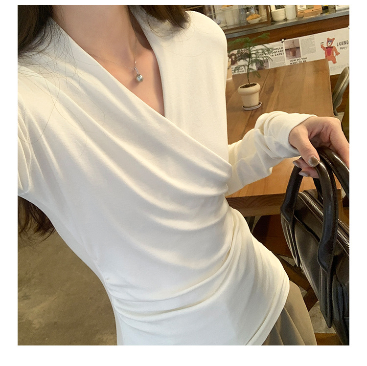 热销辣妹v领白色内搭修身打底衫女秋冬洋气设计感超好看T恤上衣