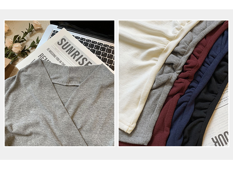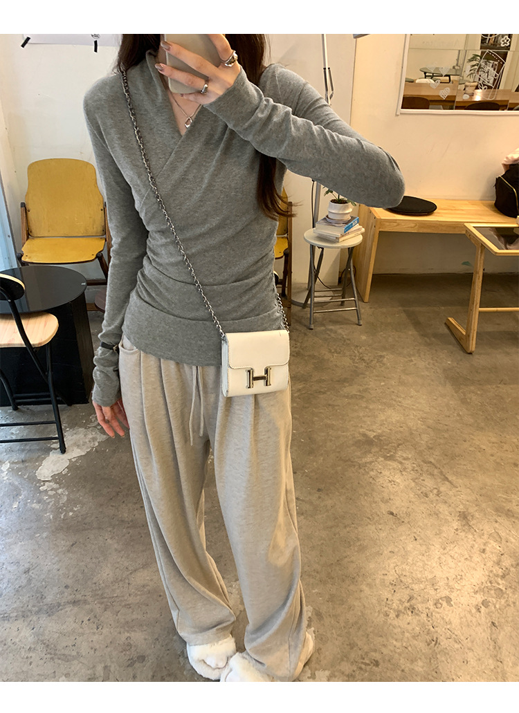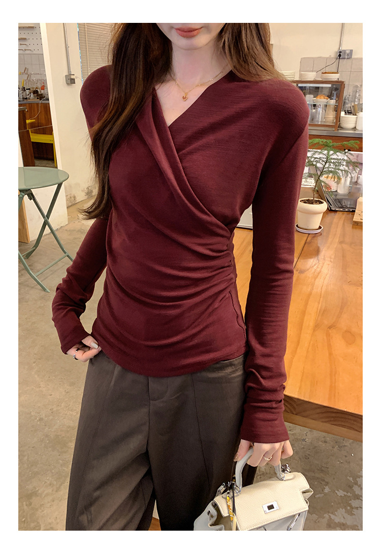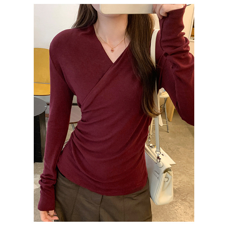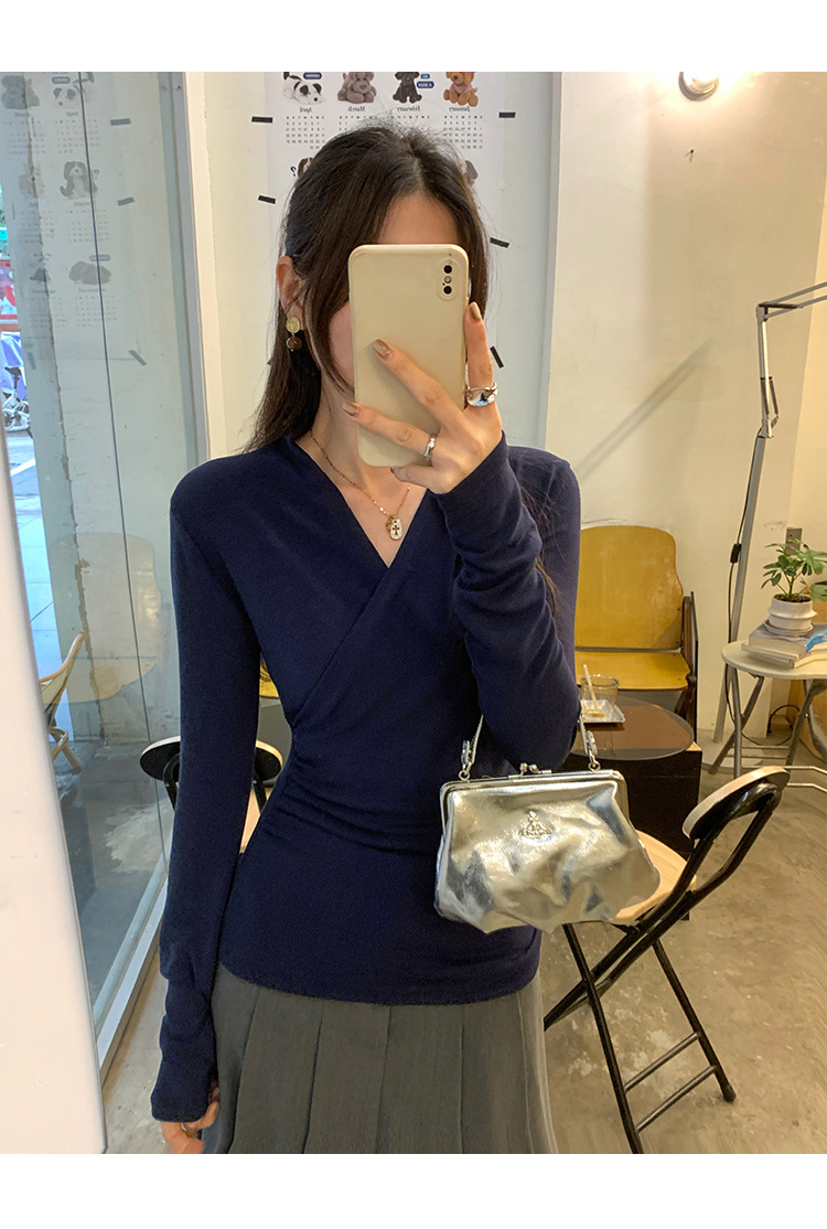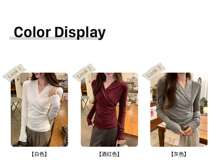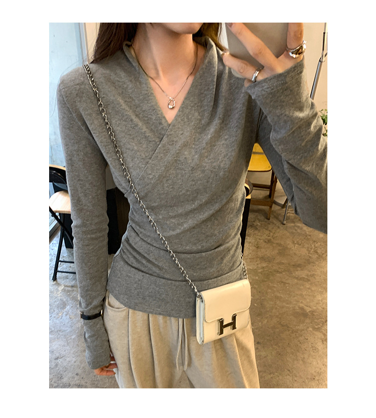 热销辣妹v领白色内搭修身打底衫女秋冬洋气设计感超好看T恤上衣