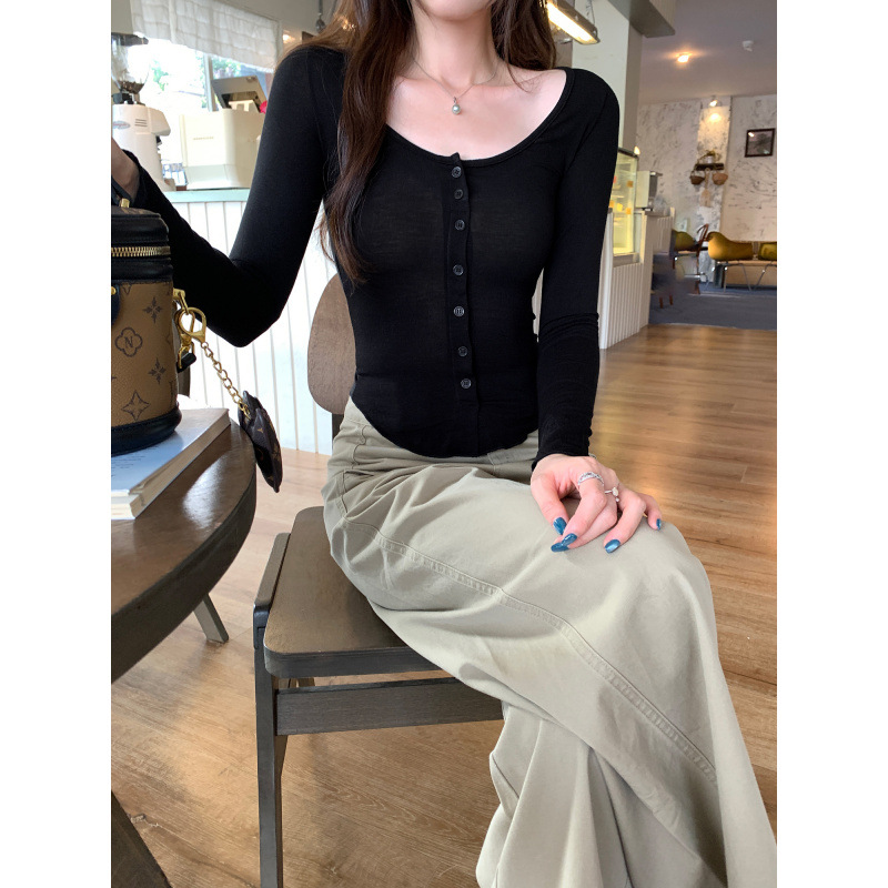 ギャルのアメリカ式の肩は身を修めて見えないファスナーの2025春の新型のtシャツの上着の長袖の中で底のシャツの女性を掛けます。
