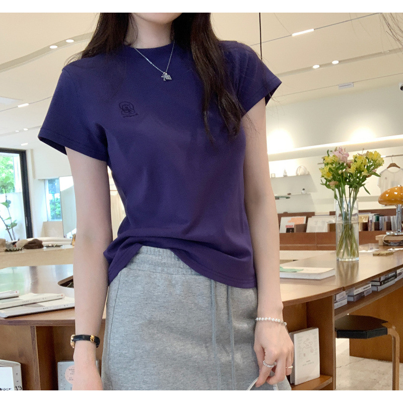 リアルショットラウンドネックスリムフィットショートTシャツフェミニン夏新作小柄万能タイト半袖トップス