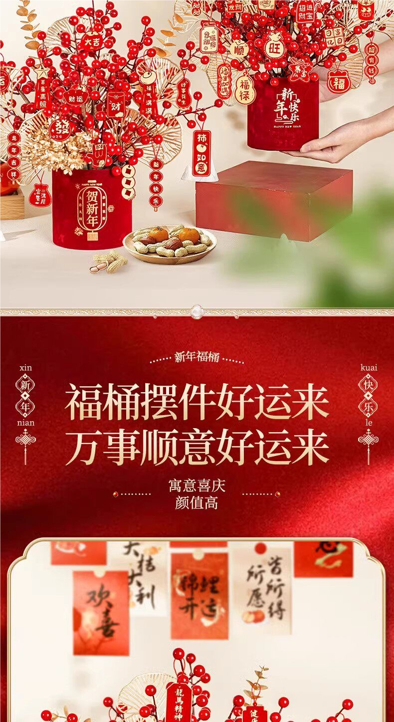 新年喜庆福桶材料冬青红果年宵花艺插花桶结婚绒布抱抱桶过年装饰