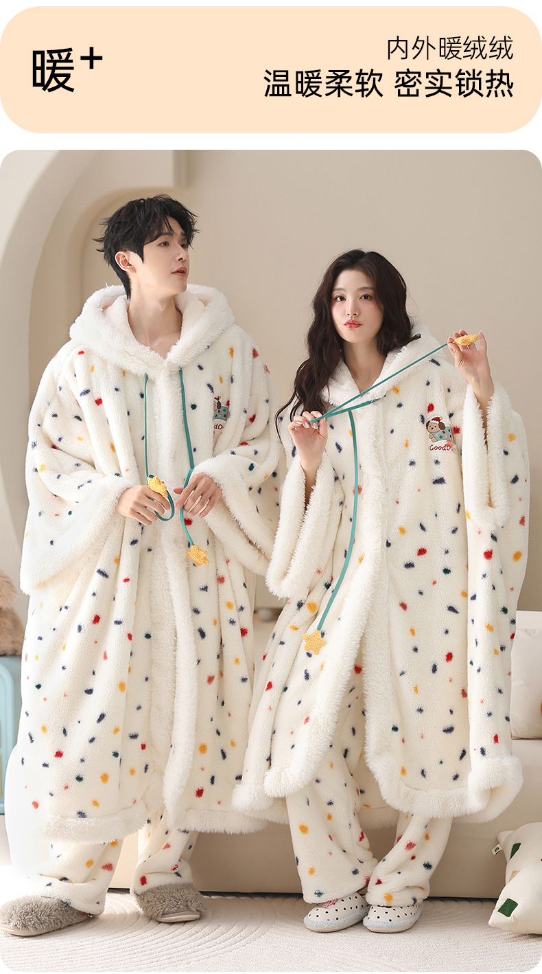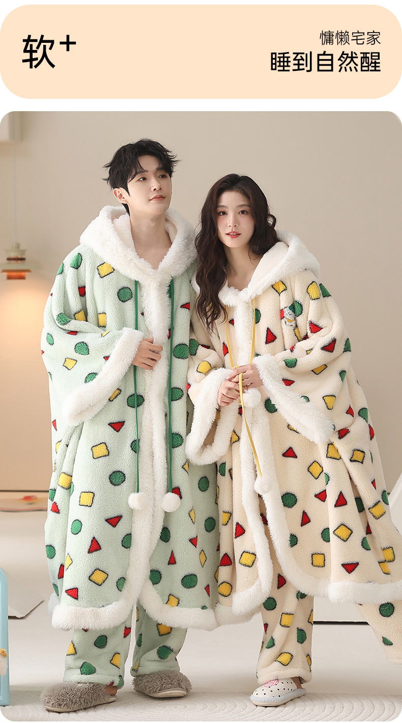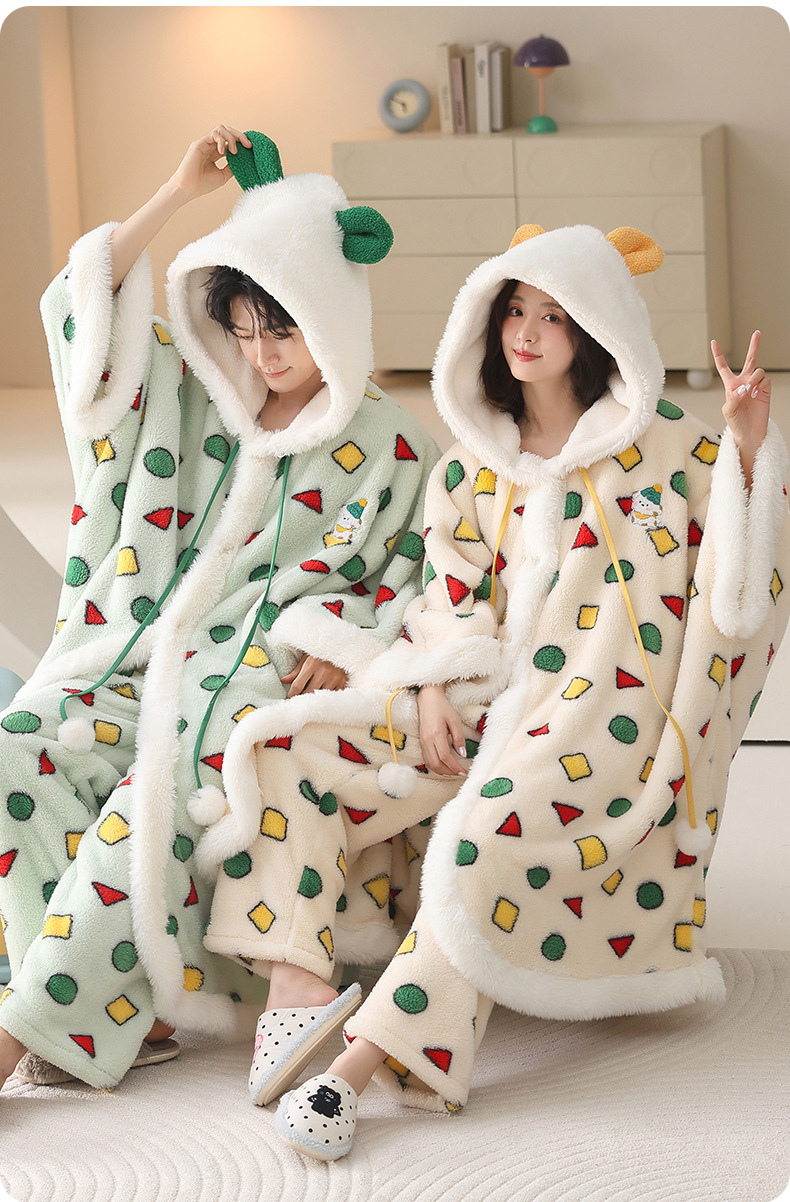 冬季情侣睡袍男女士法兰绒加绒加厚大码卡通连帽斗篷保暖家居服