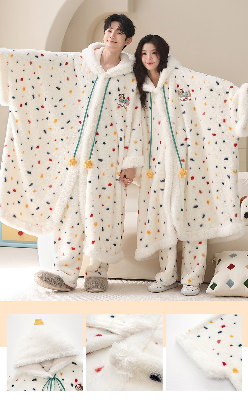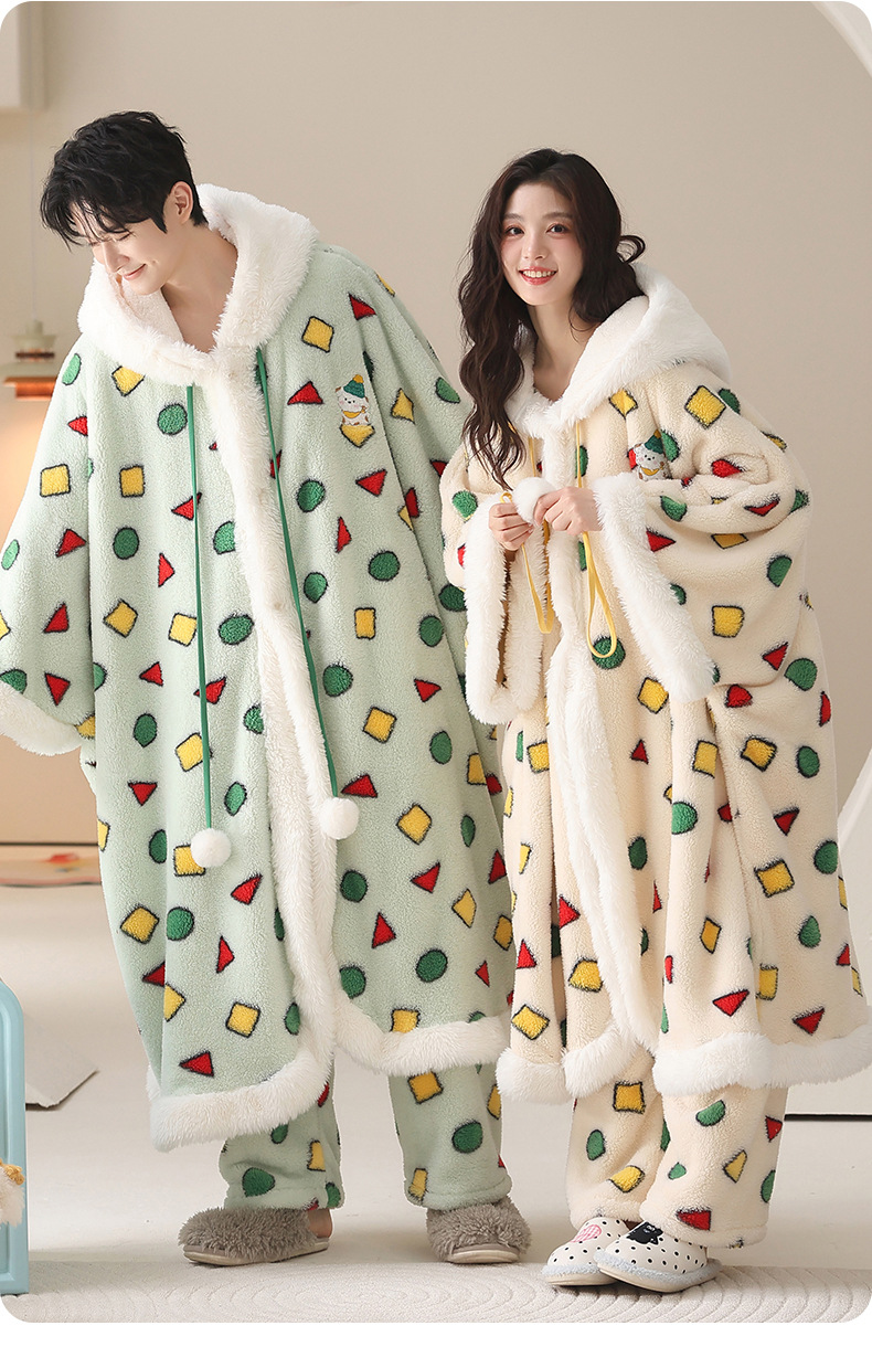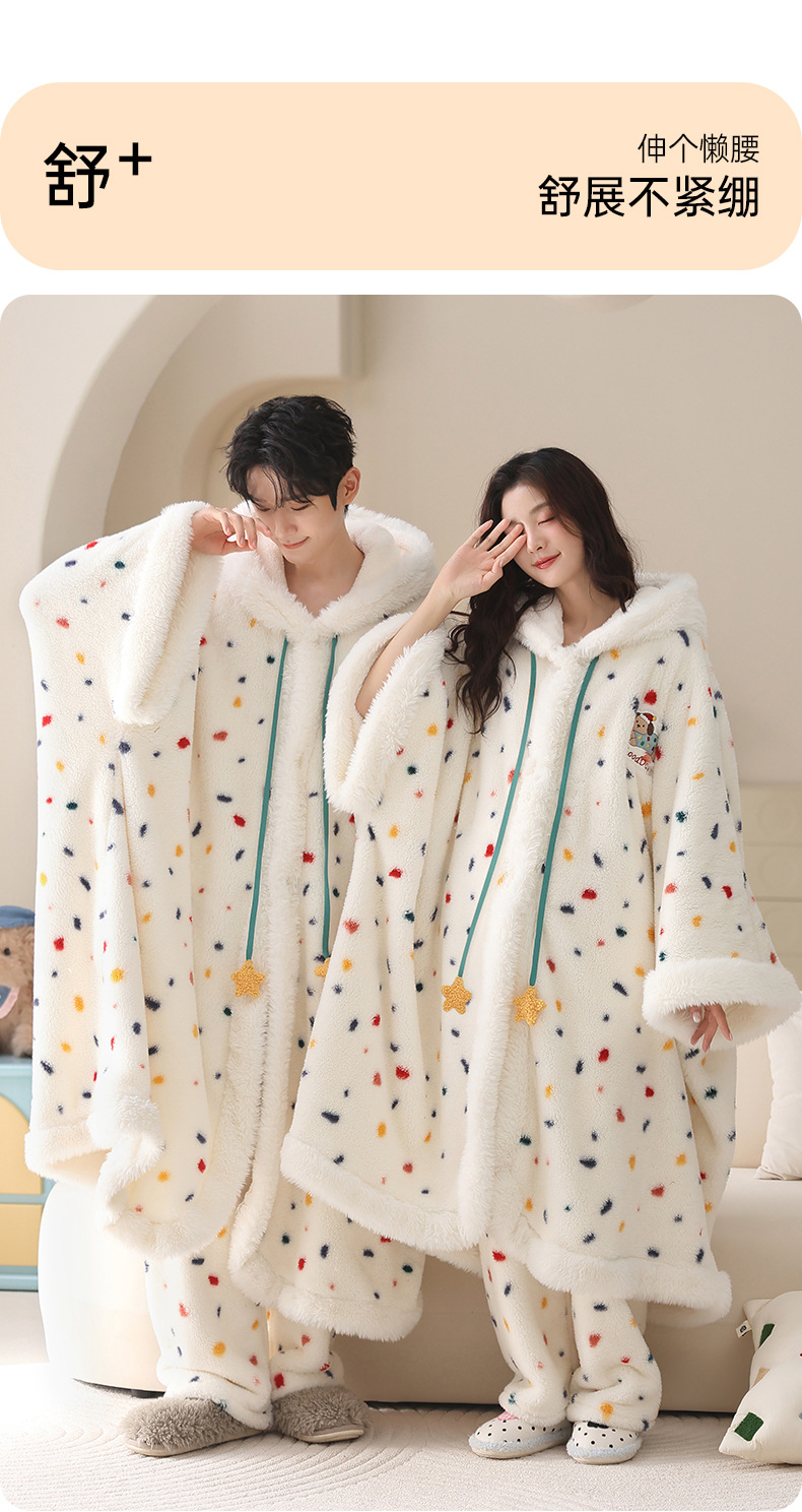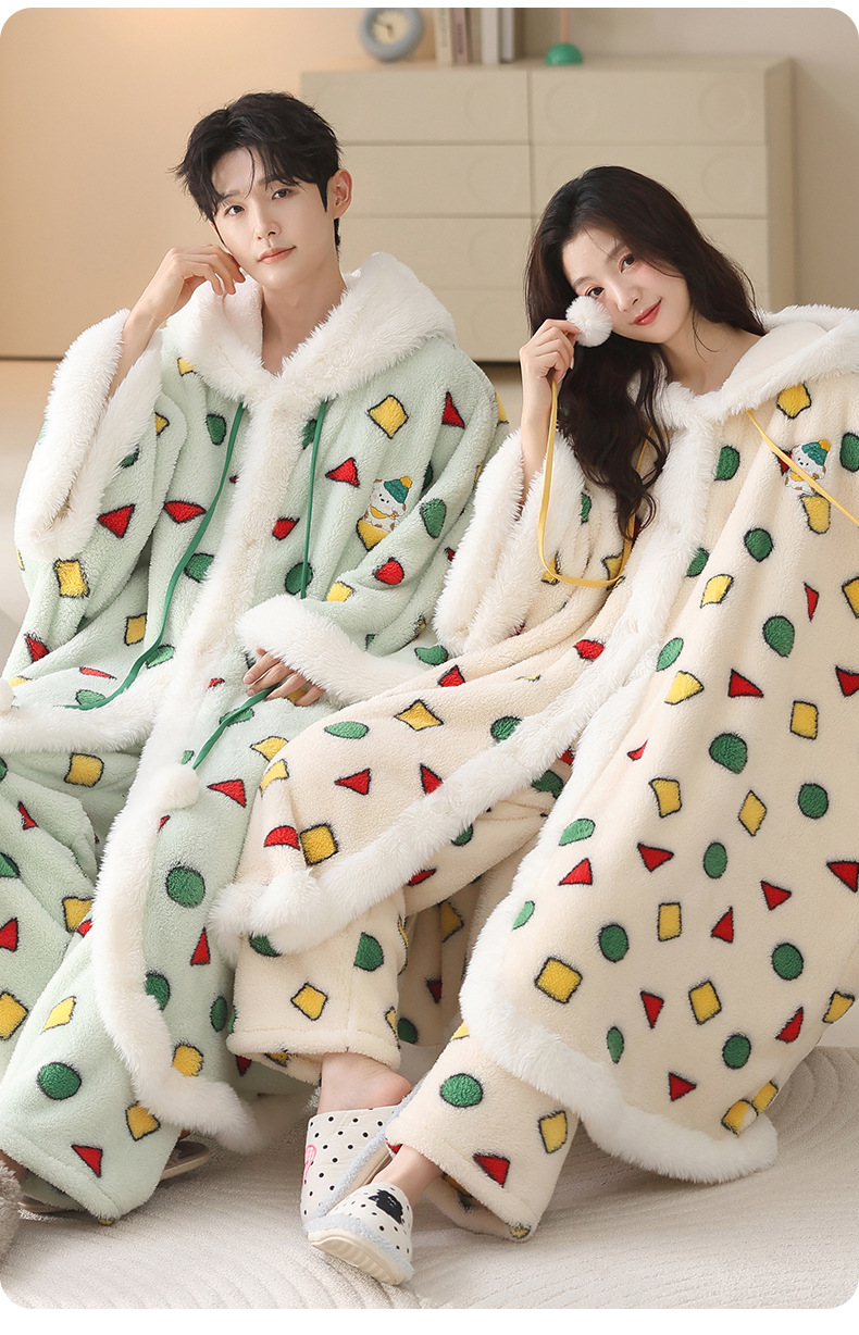 冬季情侣睡袍男女士法兰绒加绒加厚大码卡通连帽斗篷保暖家居服