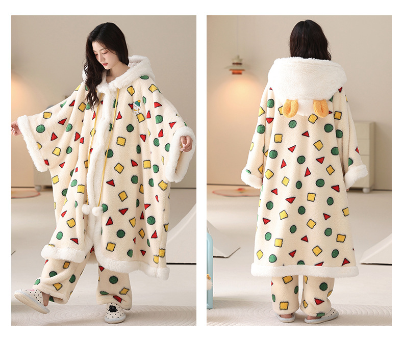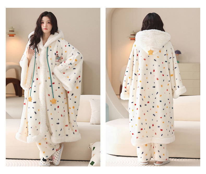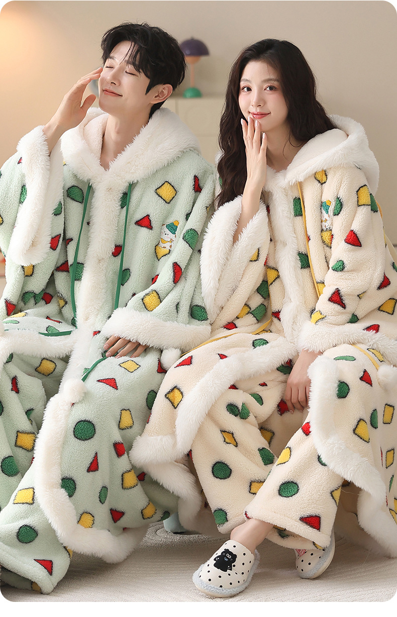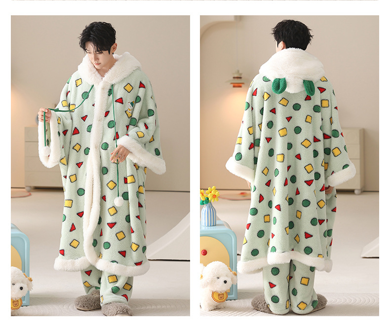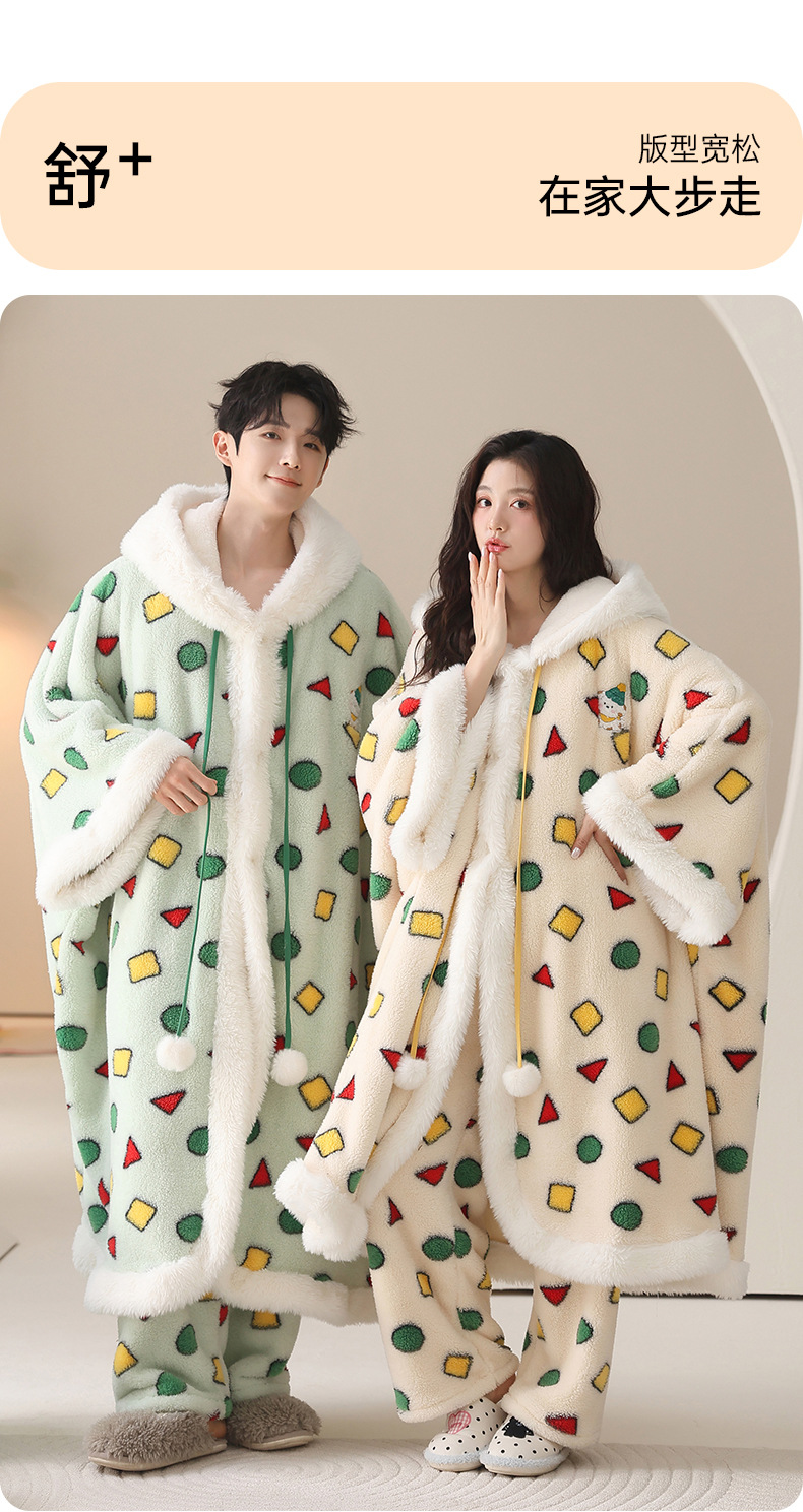 珊瑚绒三层夹棉睡衣女冬季睡袍长袖连帽加厚保暖家居服男士套装
