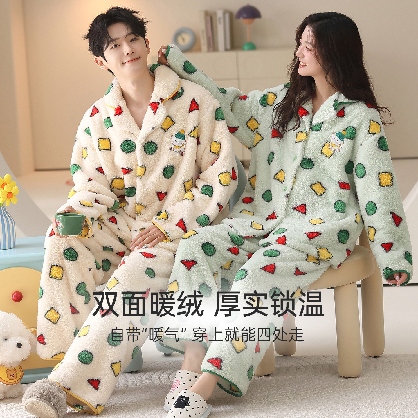 法兰绒情侣睡衣男女士冬季加绒加厚翻领卡通大码珊瑚绒家居服套装