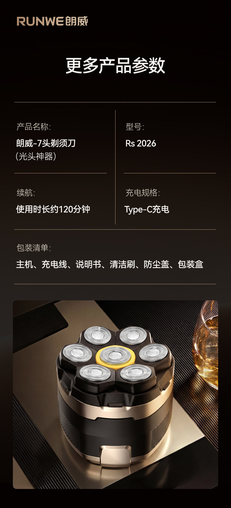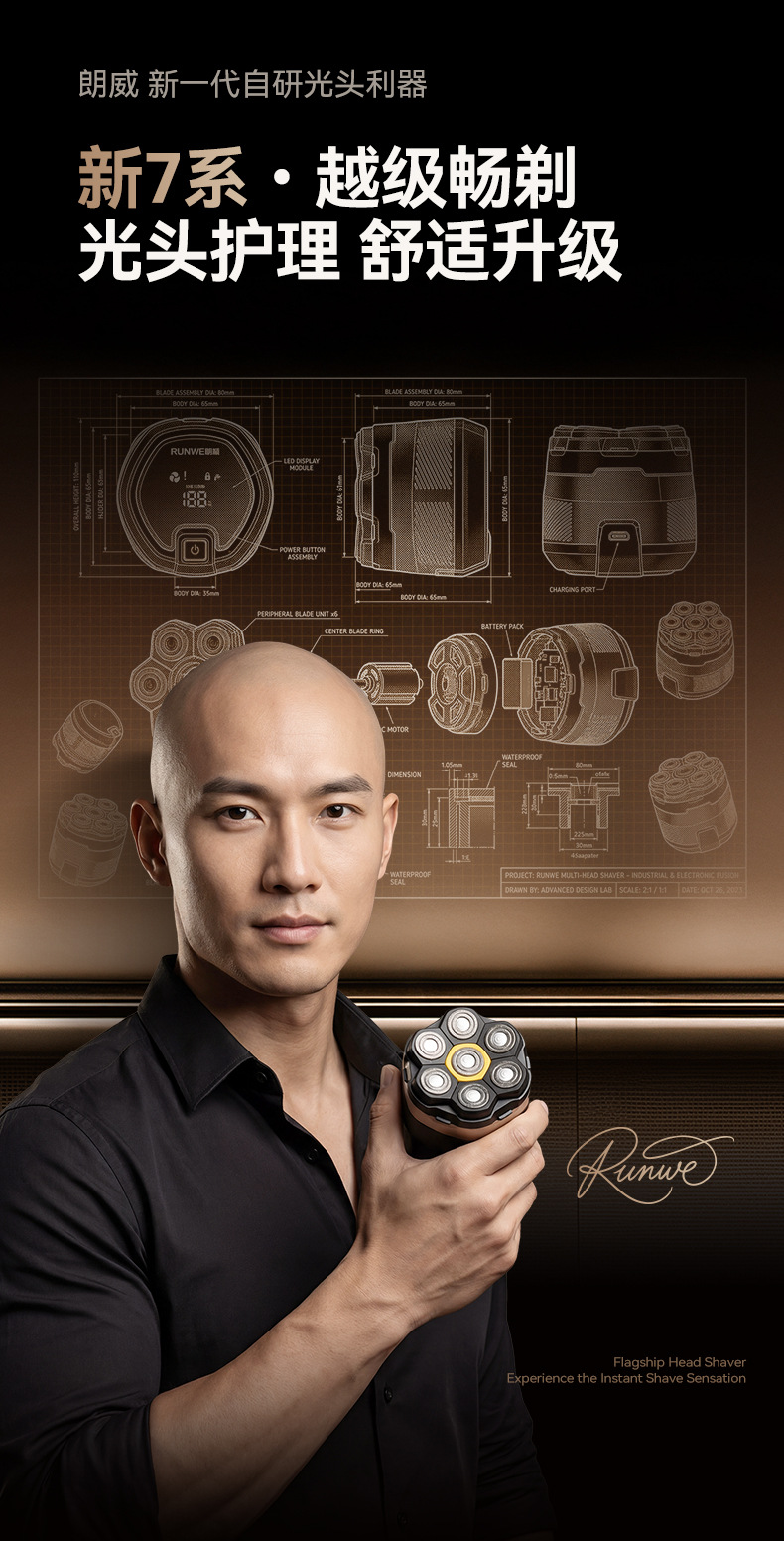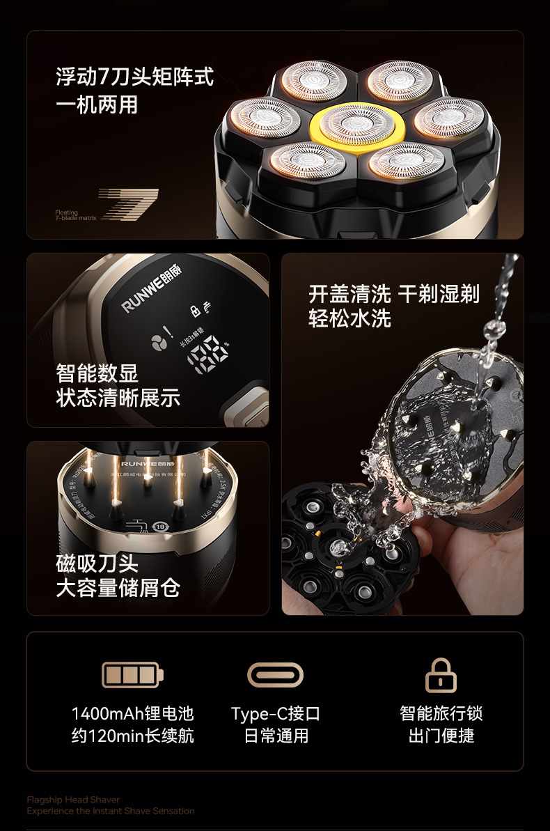 朗威电动磁吸剃须刀七刀头剃须剃光头神器充电男士剃须刀Rs2026