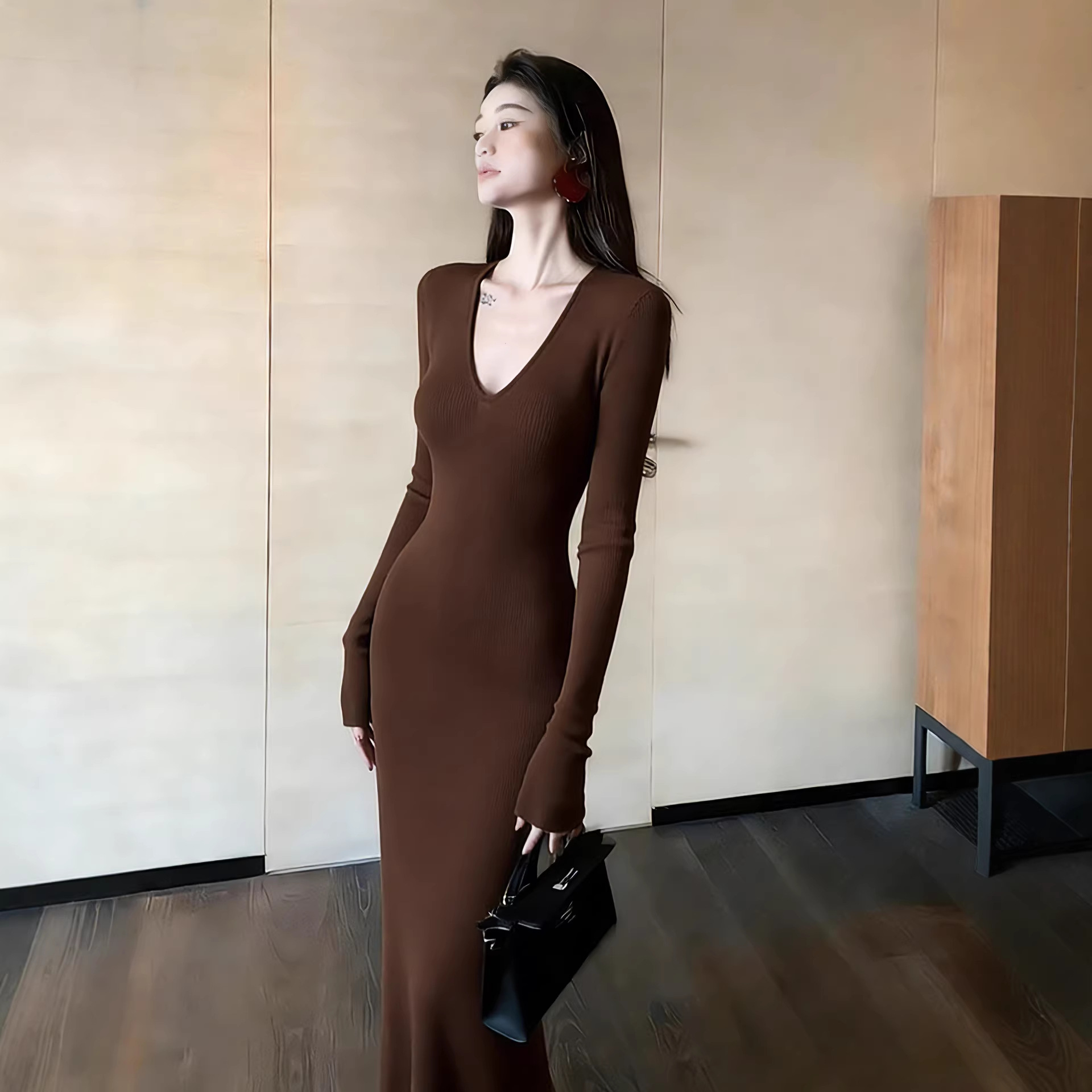 棕色V领针织连衣裙女2026新款高级感赫本风气质修身显瘦包臀长裙