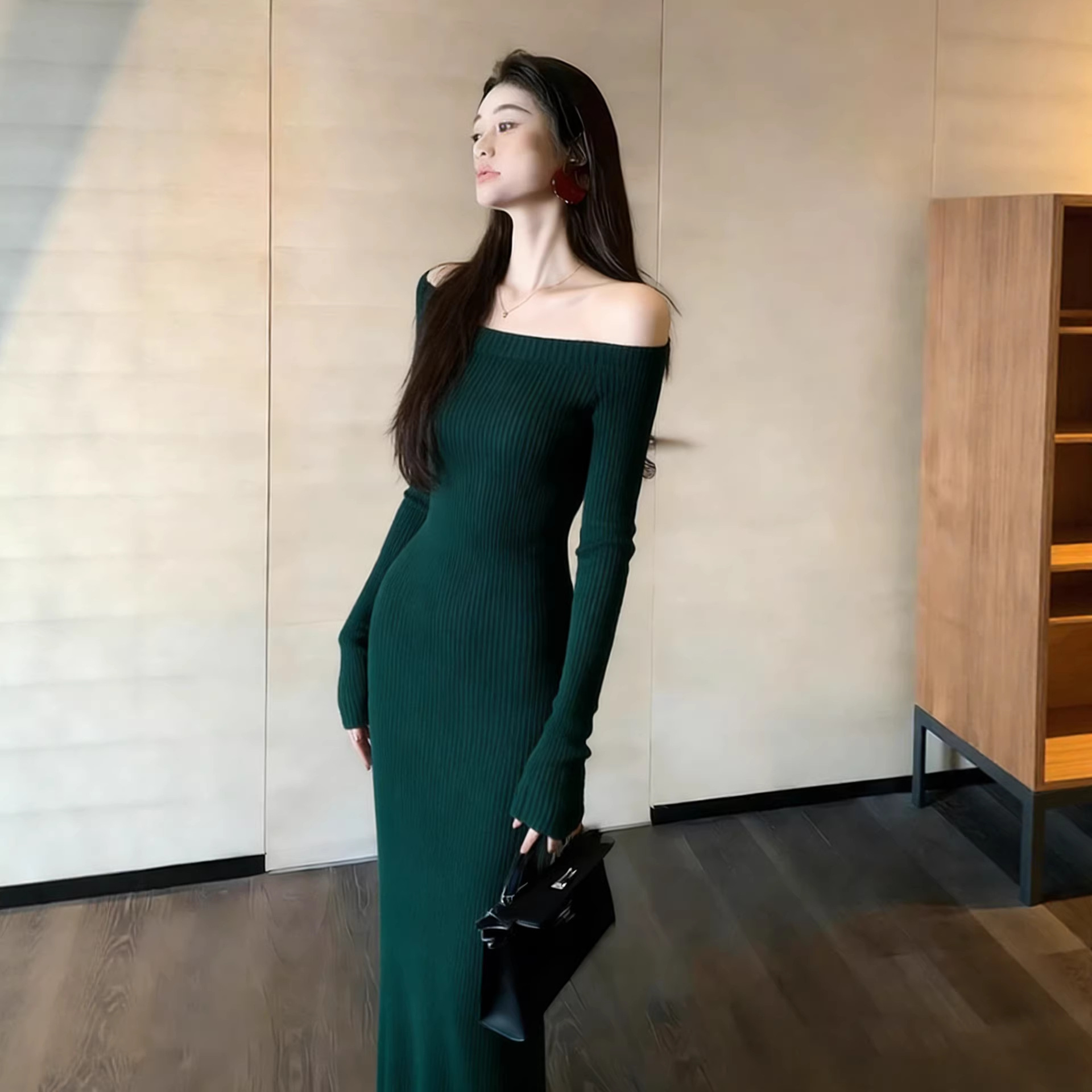 冬天配大衣的裙子巨好看的宴会法式长款内搭绿色一字肩针织连衣裙