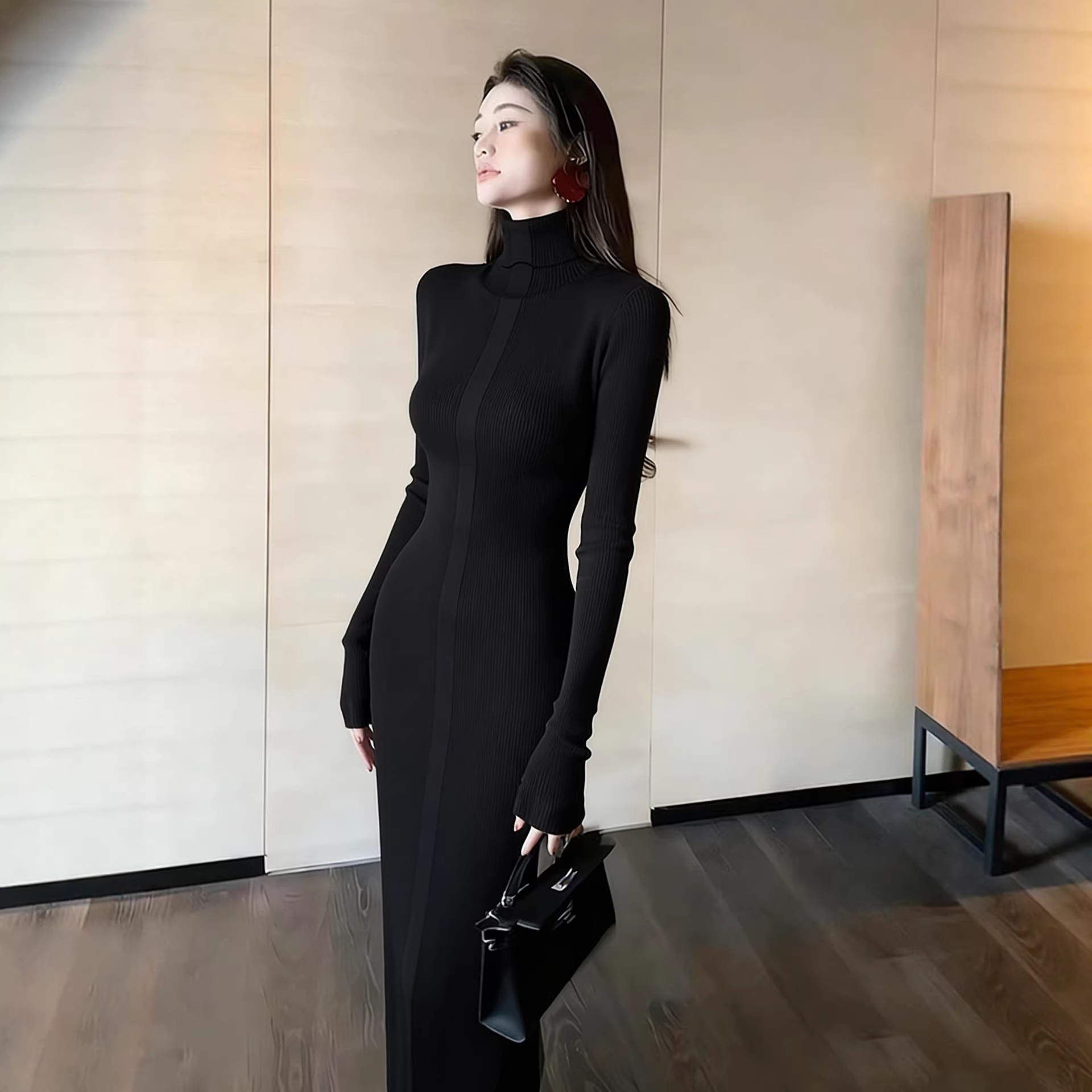 黑色高领针织连衣裙女秋冬老钱风气质高级感大衣内搭修身包臀长裙