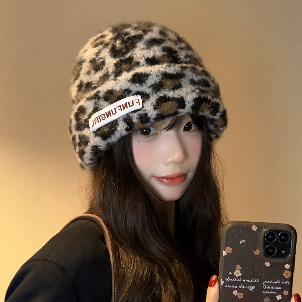 韩国订单~韩系豹纹辣妹毛绒渔夫帽复古防寒显脸小盆帽包头帽护耳