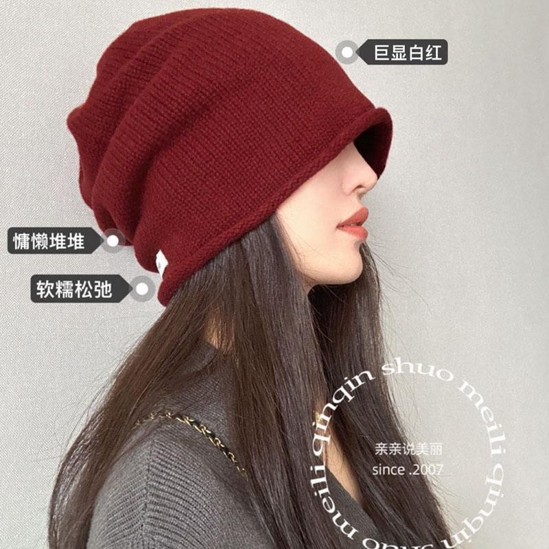 韩国订单2025新款加大显脸小含羊毛红色堆堆帽子男女冬保暖针织毛