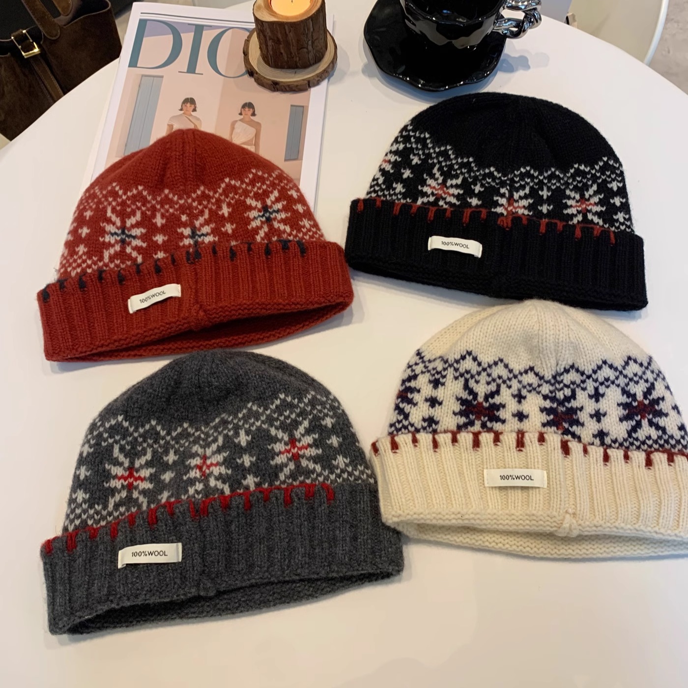 韩国订单新款全羊毛帽子女冬季复古费尔岛氛围感冰岛风针织提花毛