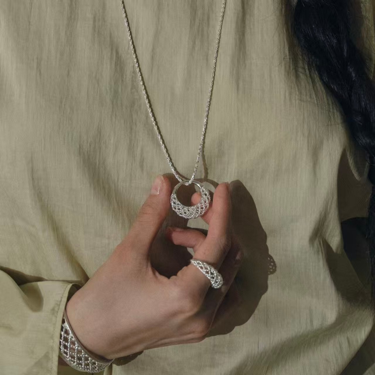 シルバー刺繍テクスチャロックバッグペンダントロングネックレスアクセサリーハイエンド女性ニッチデザインシンプルでシンプル