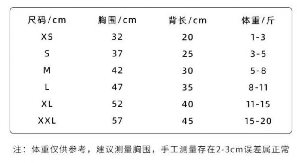 尺码 XS(建议1-3斤以内),S(建议3-5斤以内),M(建议5-8斤以内),L(建议8-11斤以内),XL(建议11-16斤以内)
