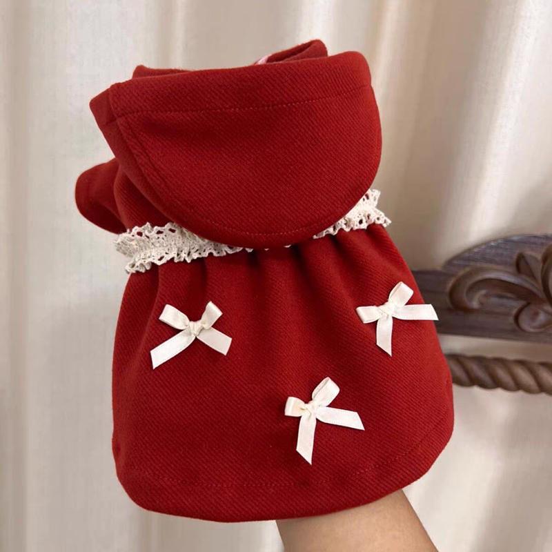 宠物秋冬季新年装加厚喜庆红色蝴蝶结连衣裙狗狗猫咪连帽两脚衣服