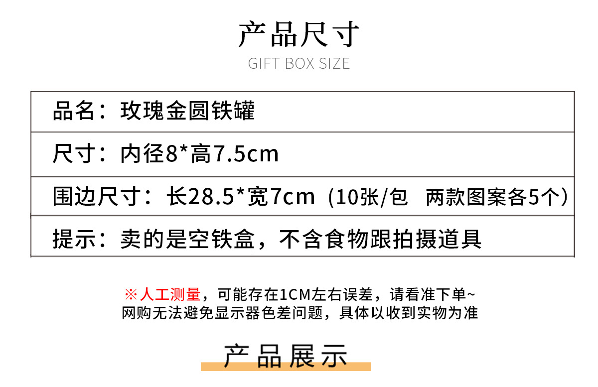 规格型号 玫瑰金铁罐 1个;见图,围边 10张;见图