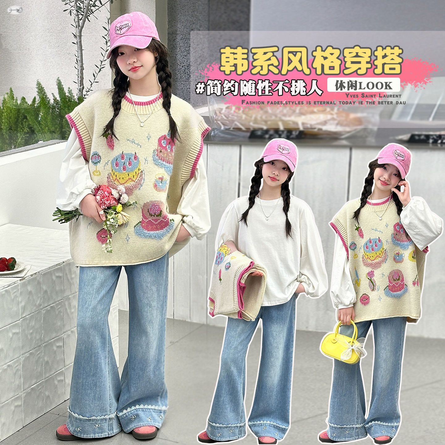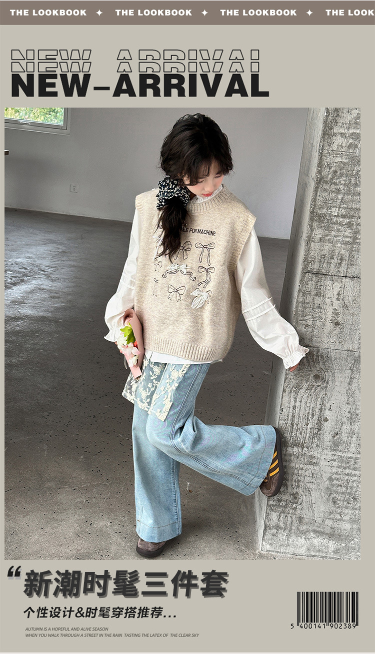 女童时尚休闲针织毛衣马甲背心早春2026宽松百搭上衣牛仔裤三件套