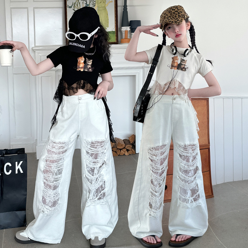 クロスボーダー女児半袖長ズボン夏レースセット2025年デザイン感上着破れワイドパンツ2点セット